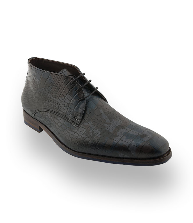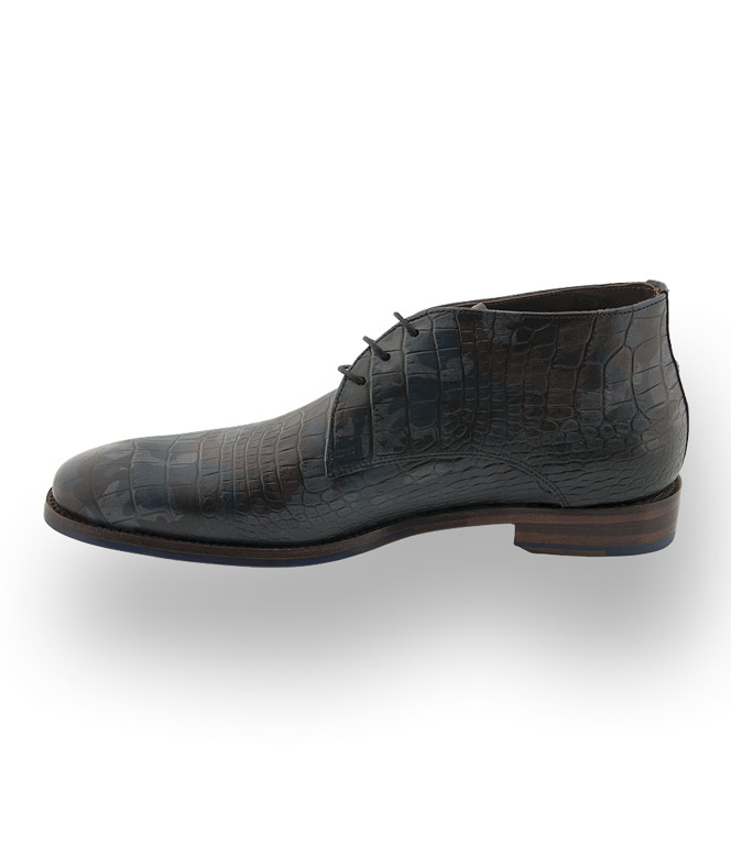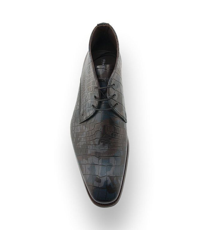 Die trendige Schnürstiefelette aus krokogeprägtem Kalbsleder lässt keine Wünsche offen. Der Camouflage-Print in blau/grau/braun, lässt sich vielfälltig kombinieren. Futter und Fußbett sind aus feinem Kalbsleder gearbeitet. Die blaue Gummilaufsohle hat ein Muster aus Puzzleteilen und unterstreicht das erfrischende Design.