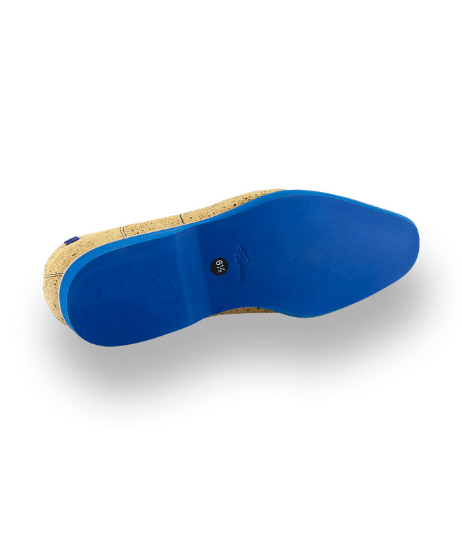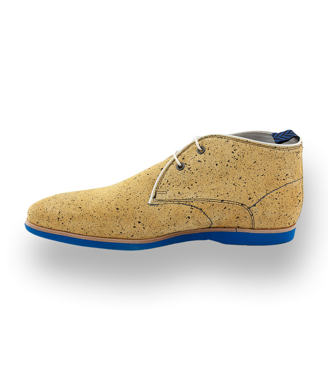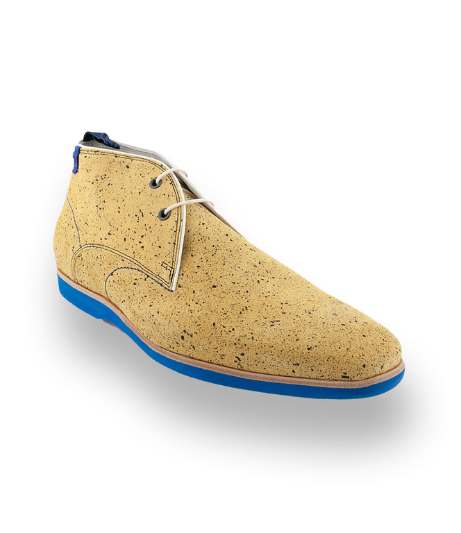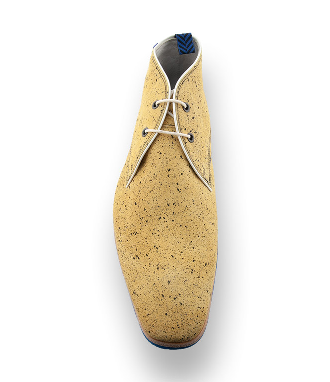 Der Desertboot von Floris van Bommel aus weichem gelbem, bedrucktem Veloursleder und der leuchtend blauen Microsohle ein modisches Highlight für den Mann. Das Futter ist aus Kalbsleder und das Lederfußbett lässt sich austauschen. Ein attraktives Muster am Zungeabschluss peppt das Ganze.