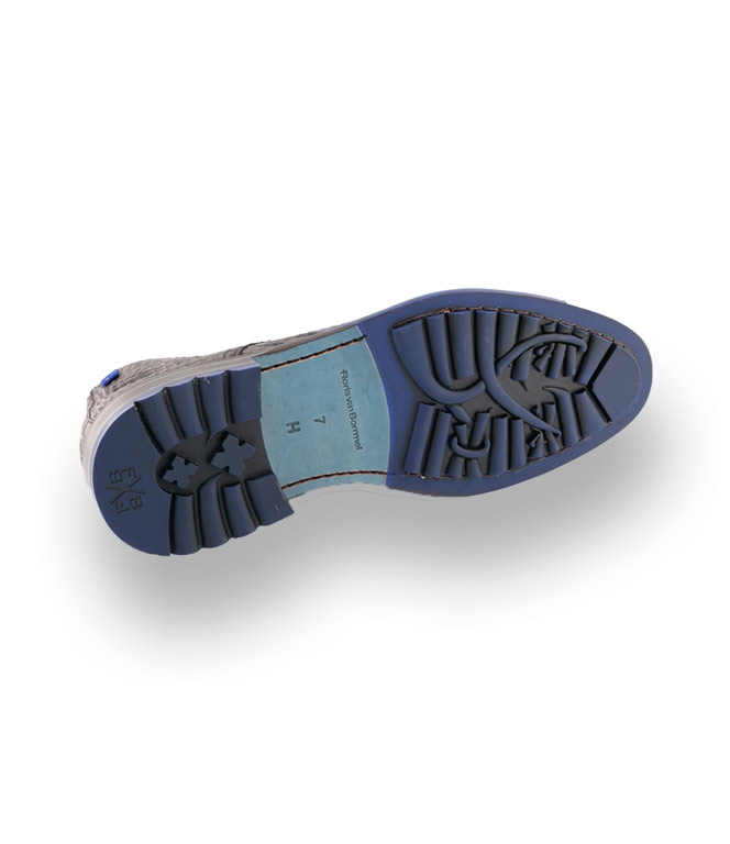 Die trendige Schnürstiefelette aus krokogeprägten Glattleder in angesagtem grauen Camouflage wird sie begeistern. Futter und Fußbett sind aus feinem Kalbsleder gefertigt. Die durchgenähte Gummilaufsohle in pfiffigem royalblau, blaue Schuhbänder und das Logo im Fersenbereich sprechen für die Detailverliebte Verarbeitung. Die stylische Derby-Stiefelette passt zu jedem Outfit - ob im Büro oder in der Freizeit - Floris van Bommel rückt ihre Füße immer ins rechte Licht.