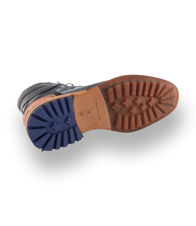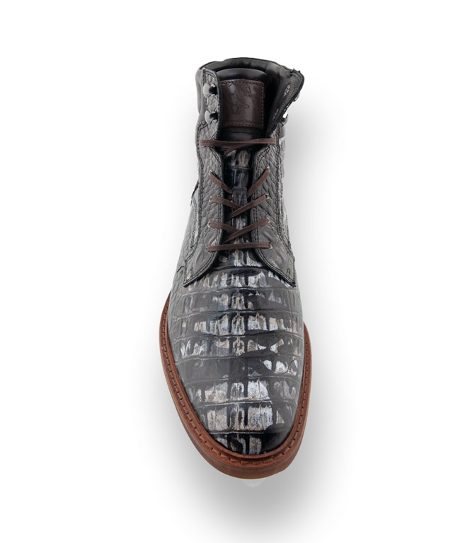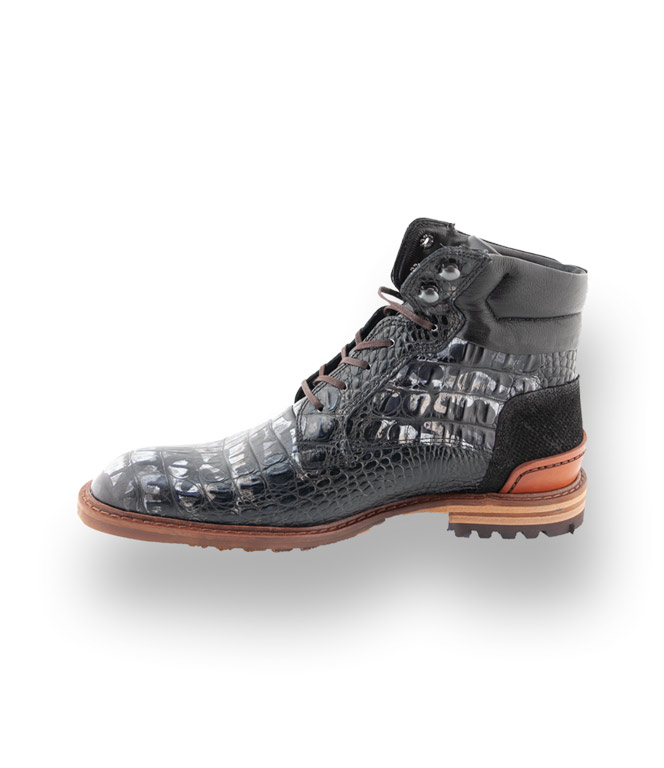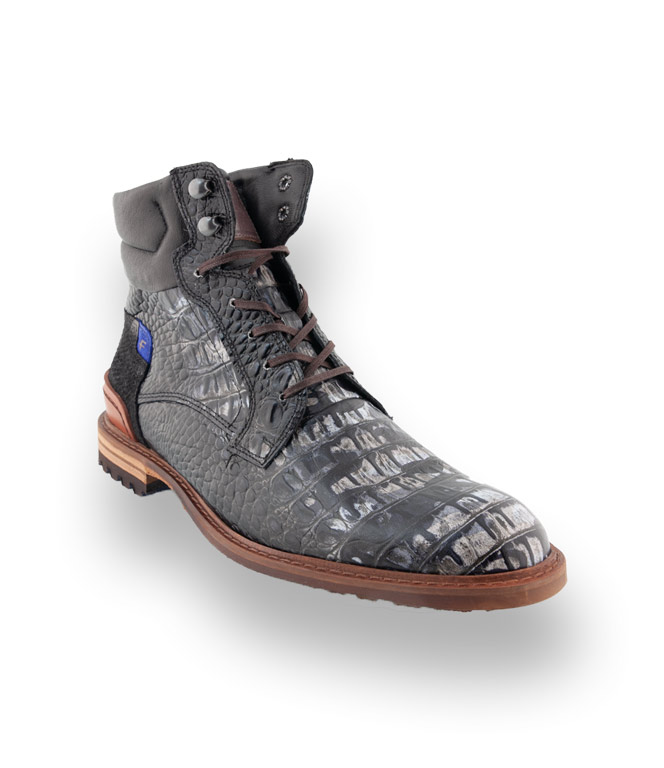 Kalbsleder in einem aufregenden Krokoprint, in Camouflage, macht aus dem Schnürstiefel einen Hingucker. Die Farbkombination aus schwarz, grau und taupe passt zu jedem Outfit. Rauer Look in top Qualität. Die durchgenähte Laufsohle, mit Profil, wird durch den hellen Zierrahmen besonders hervorgehoben. Floris van Bommel - macht Männerträume wahr.