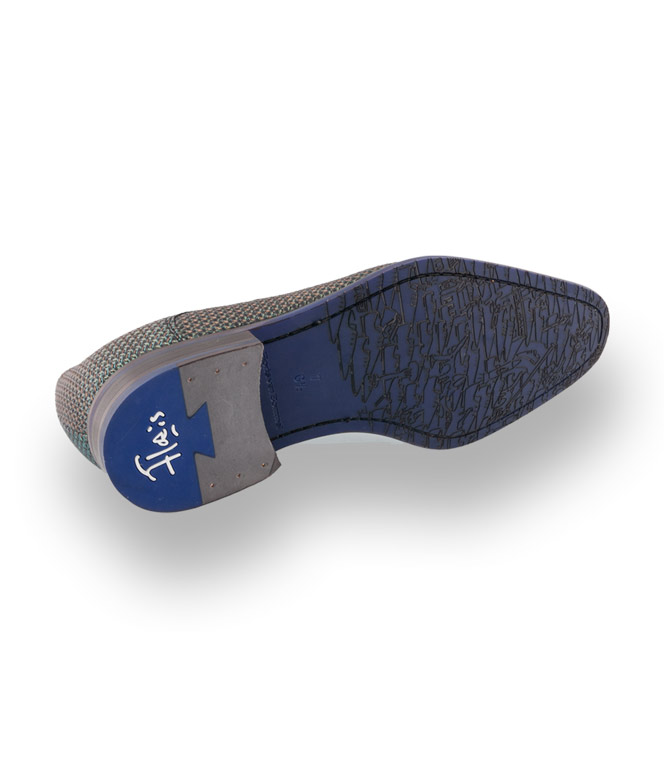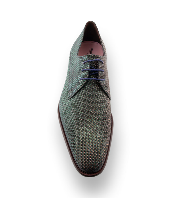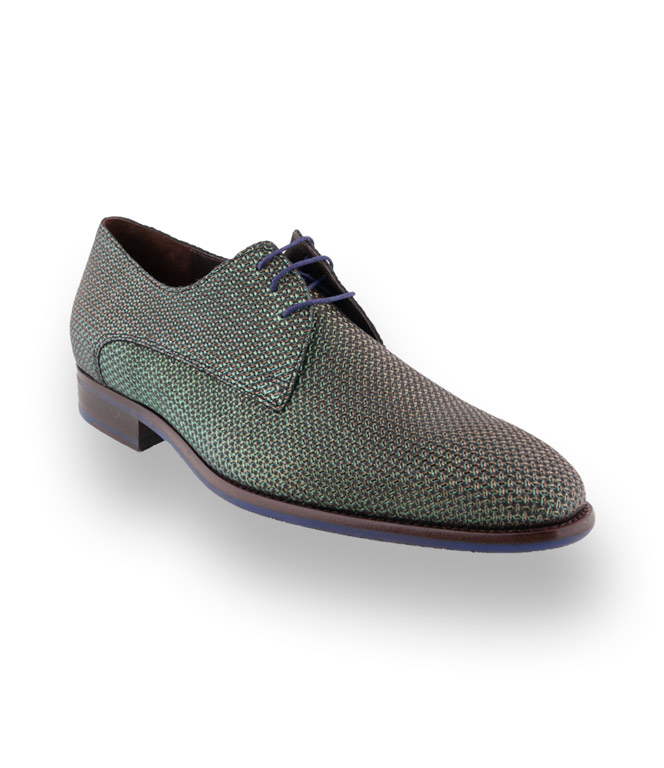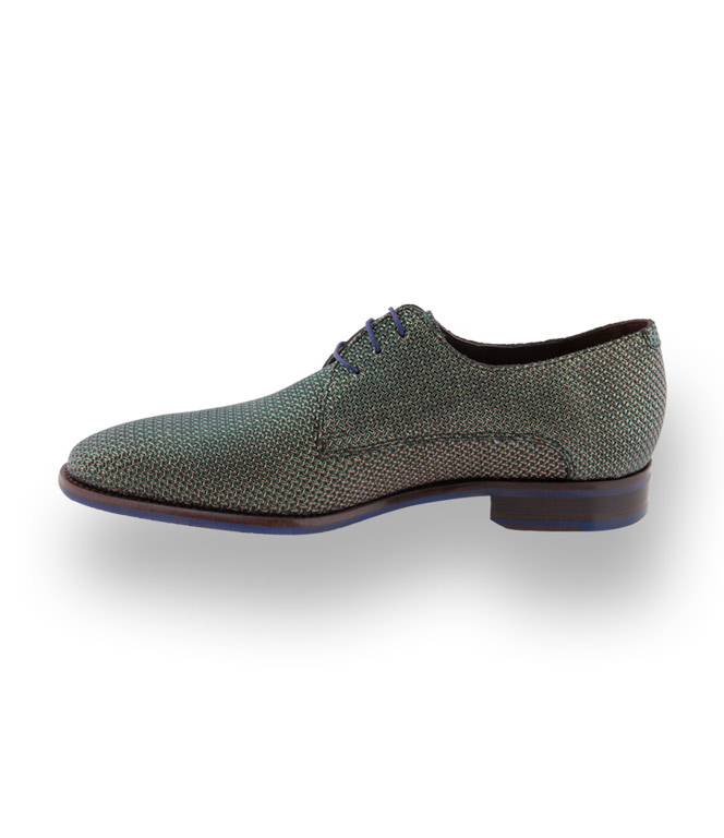 Edles Kalbsleder geprägt in grün, goldfarbener Prägung machen den Derby zu einem Hingucker. Hochwertiges Lederfutter und die arbeitsintensive Durchnaht überzeugt den anspruchsvollsten Mann. Royalblaue Einsätze im Absatz- und Sohlenbereich unterstreichen das originelle Design.
