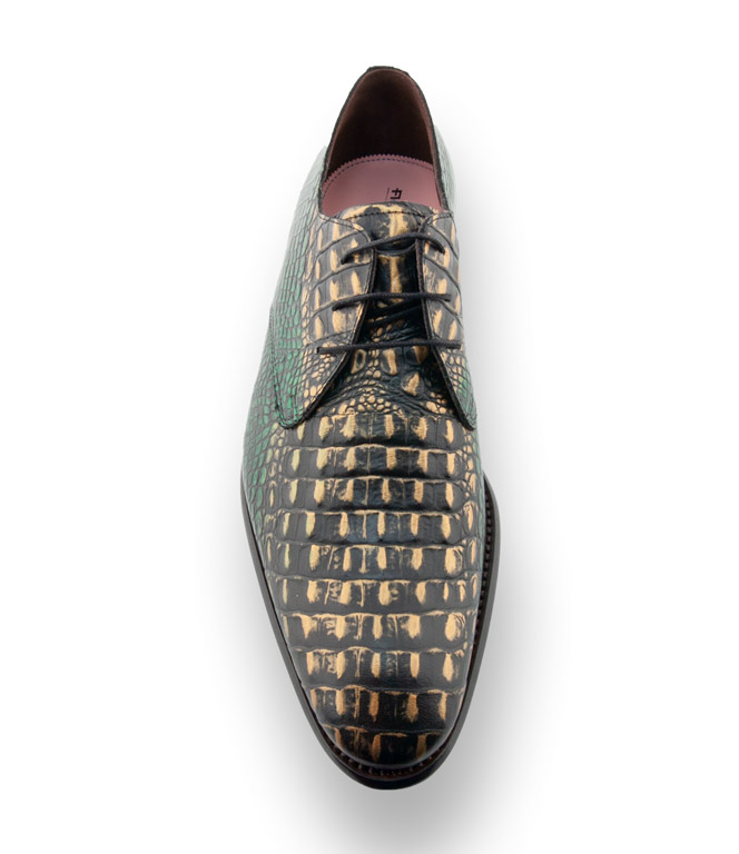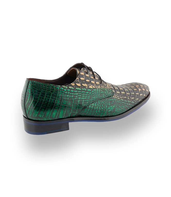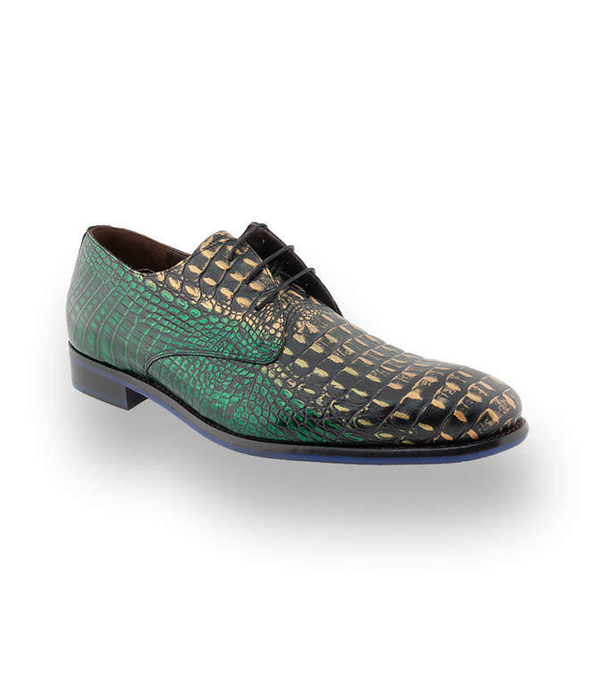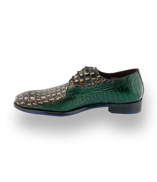 Edles Kalbsleder geprägt in grün, goldfarbener Krokoprägung machen den Derby zu einem Hingucker. Hochwertiges Lederfutter und die arbeitsintensive Durchnaht überzeugt den anspruchsvollsten Mann. Royalblaue Einsätze im Absatz- und Sohlenbereich unterstreichen das originelle Design.