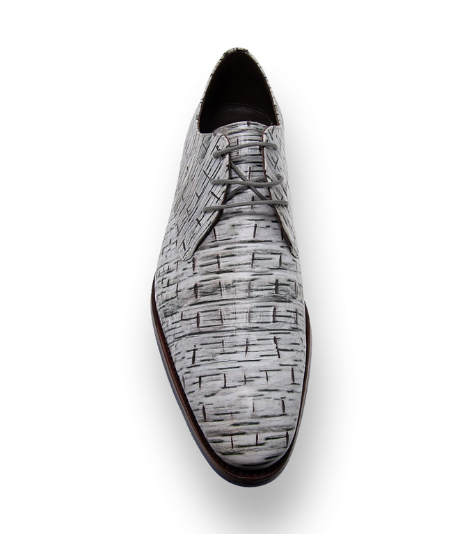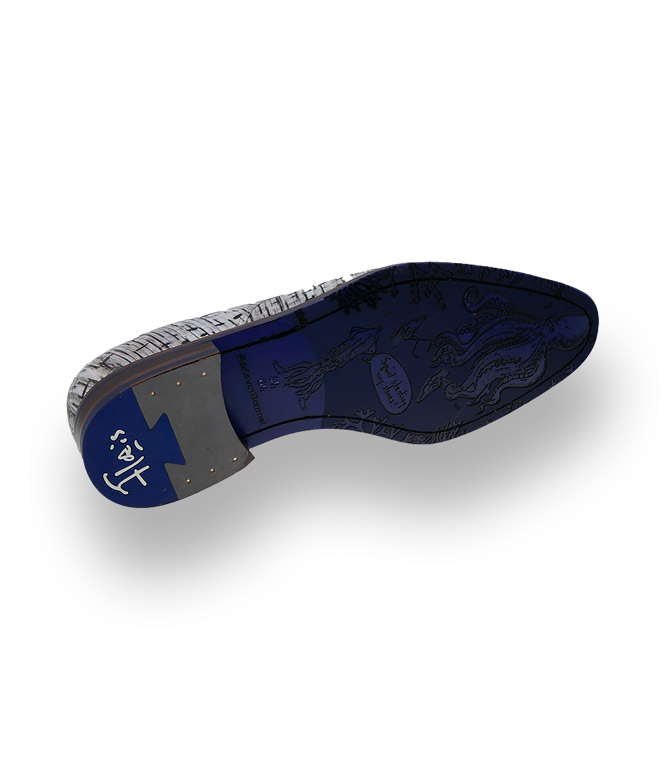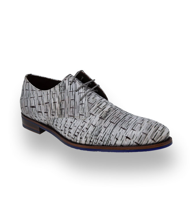 Edles Kalbsleder geprägt in weiß, grau schwarzer Prägung machen den Derby zu einem Hingucker. Hochwertiges Lederfutter und die arbeitsintensive Durchnaht überzeugt den anspruchsvollsten Mann. Royalblaue Einsätze im Absatz- und Sohlenbereich unterstreichen das originelle Design.