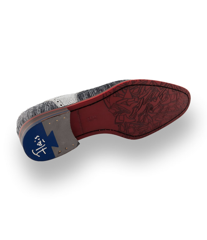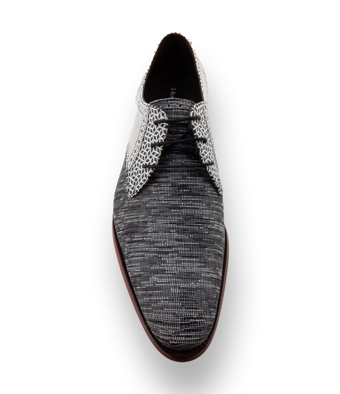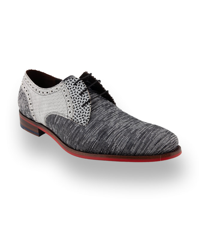 Edles Kalbsleder geprägt in schwarz mit weiß in verschiedenen Drucken, machen den Derby zu einem Hingucker. Hochwertiges Lederfutter und die arbeitsintensive Durchnaht überzeugt den anspruchsvollsten Mann. Rote Einsätze im Absatz- und Sohlenbereich unterstreichen das originelle Design.