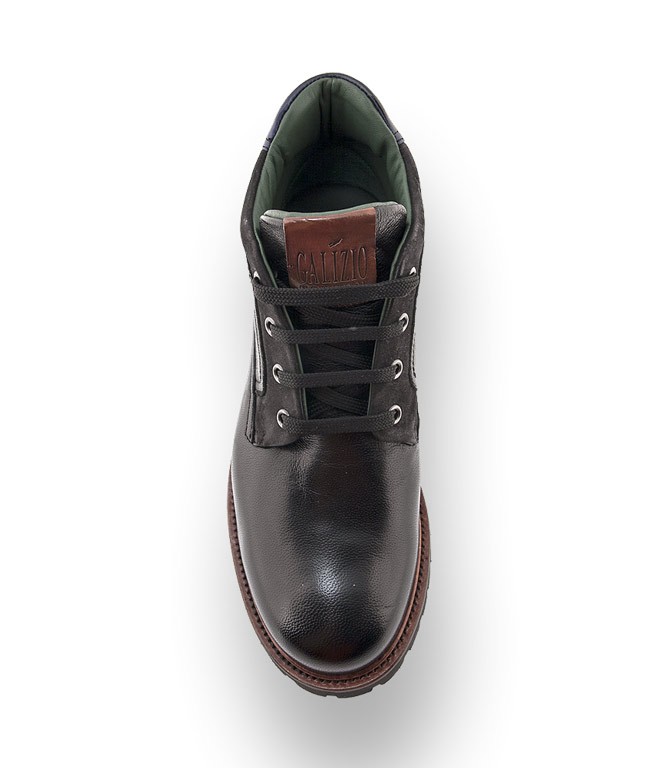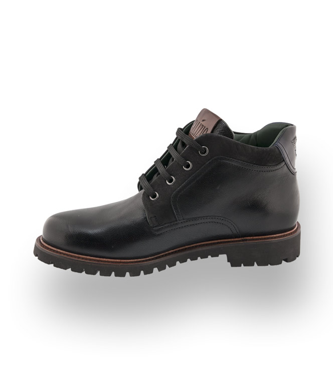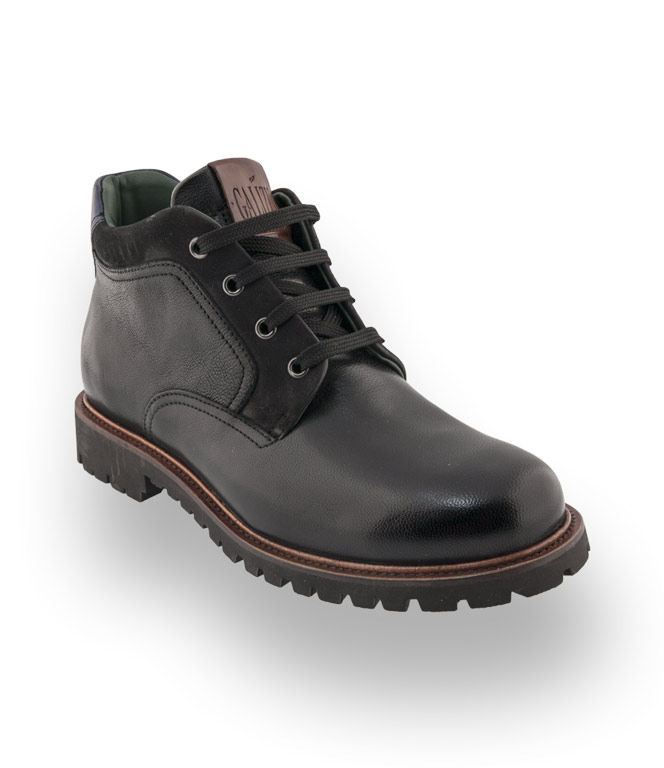 Eine robuste Stiefelette aus genarbten schwarzen Kalbsleder mit einer Profilsohle und Sie sind auch auch an Regentagen perfekt unterwegs.