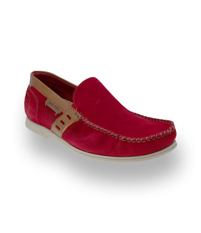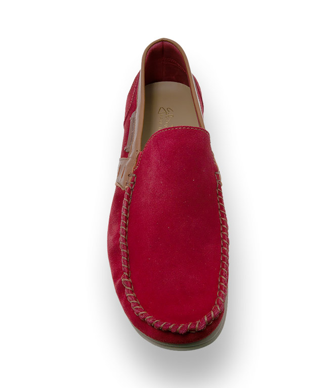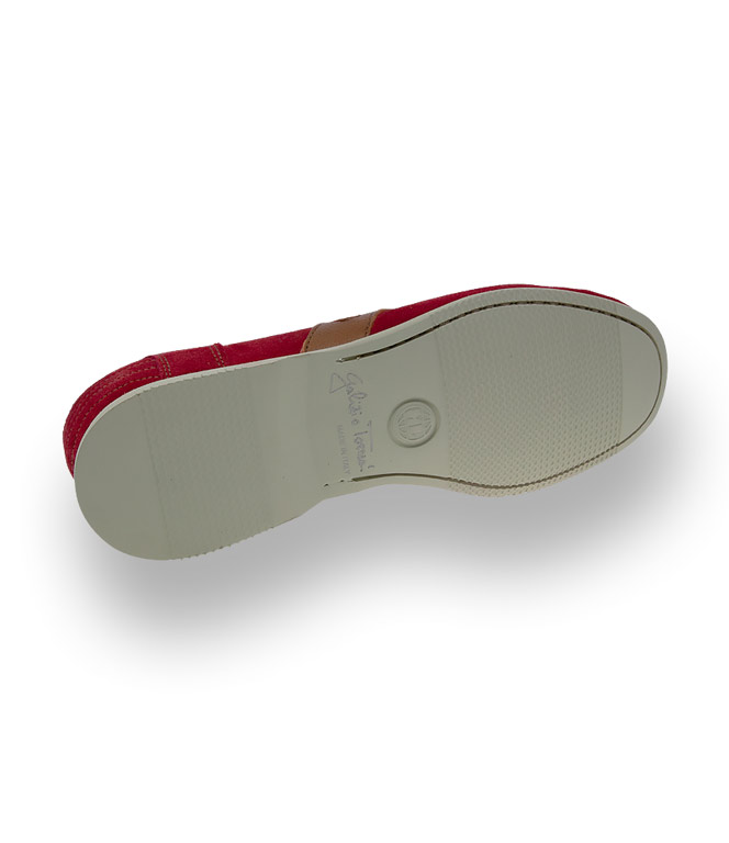 Superleichter Mokassin von Galizio Torresi aus rotem Veloursleder und der Sommer kann kommen. Braune Nähte und braune Details - dies wirkt erfrischend und der Slipper wird zum idealen Partner im Casualbereich. Die Lederinnensohle ist austauschbar und somit geeignet für lose Einlagen. Eine durchgenähte helle Microsohle sorgt für Bequemlichkeit und vervollständigt das Bild.