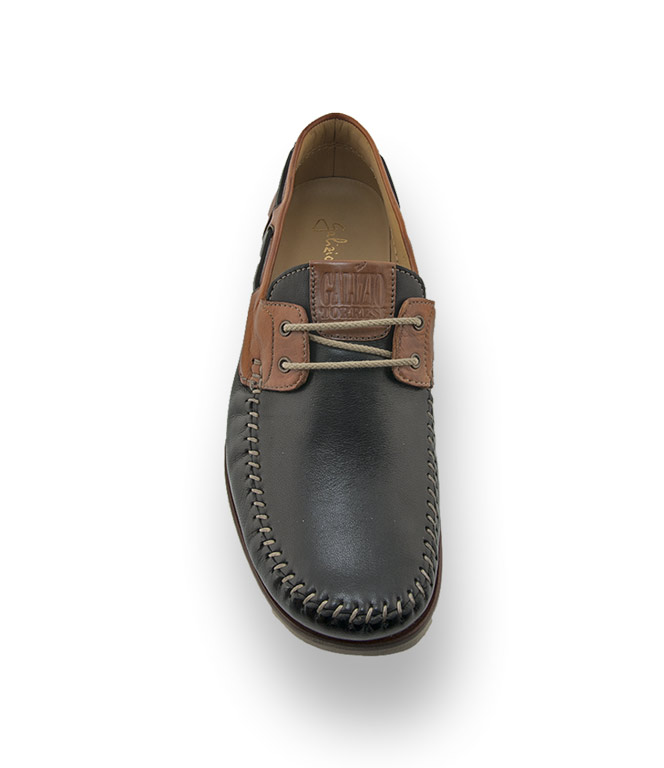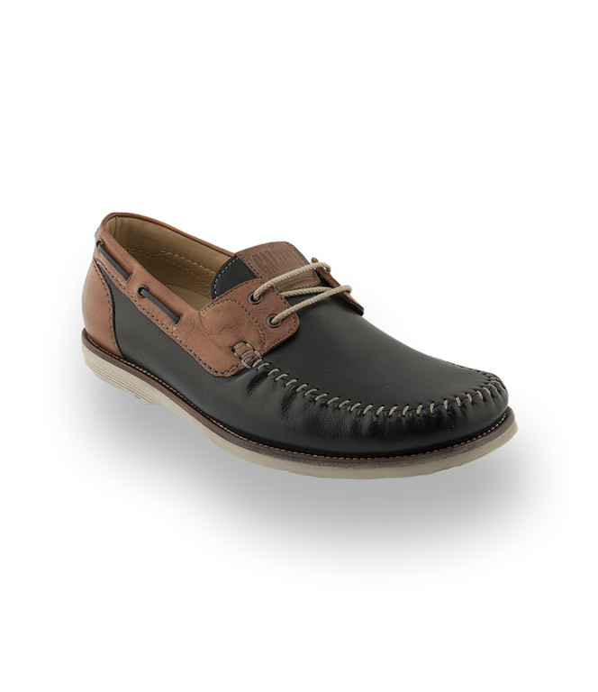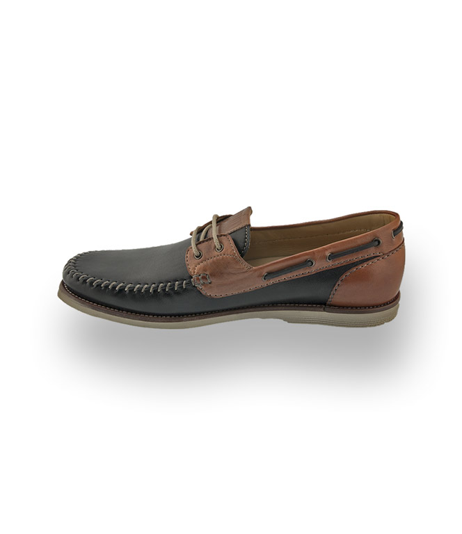 Das geschnürte Modell, in klassischem schwarz - braun, überzeugt durch viele Extras. Helle Nähte, braune Applikationen und das typische durchgezogene Lederband, machen Lust auf Sommer. Edles Lederfutter und die durchgenähte, helle Microsohle, mit braunem Rahmen, befriedigen selbst höchste Ansprüche. Durch die austauschbare Sohle eignet sich der leichte Mokassin auch für lose Einlagen.