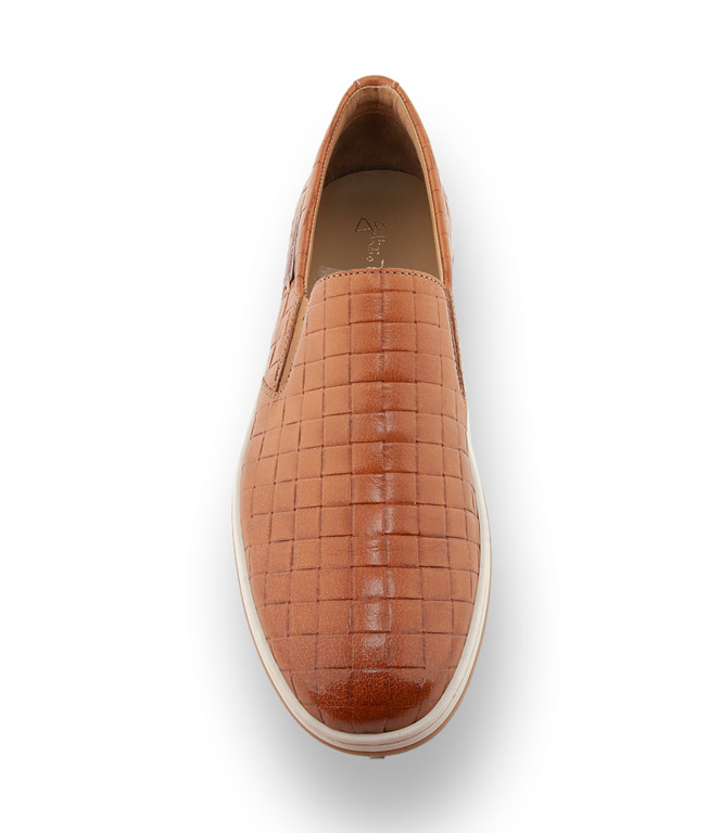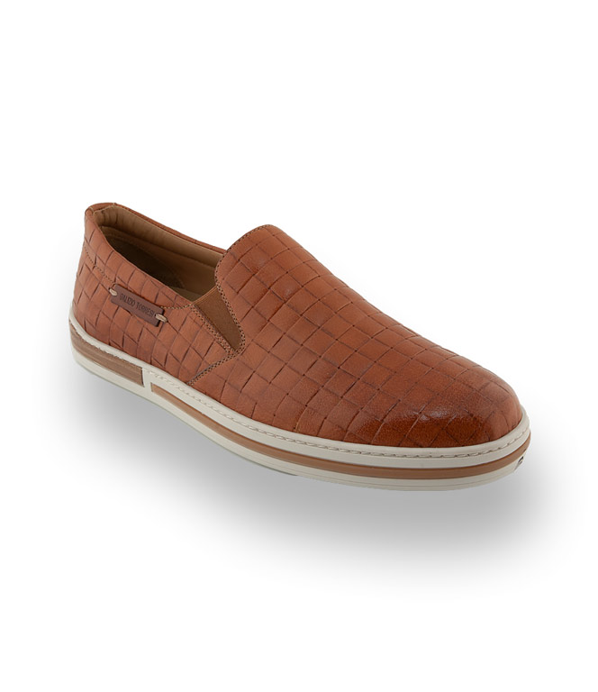 Qualität für höchste Ansprüche. Braunes, geprägtes Leder in Flechtoptik und die helle Sohle, machen Lust auf Urlaub mit Bermuda und diesen Schuhen an der Strandpromenade zu schlendern. Die seitlichen Gummieinsätze ermöglichen einen leichten Einstieg. Weiches Lederfutter und Lederdecksohle sind bei Galizio Torresi Standard.