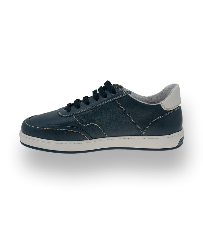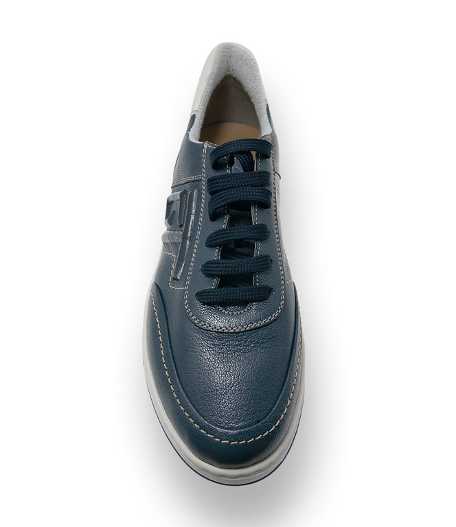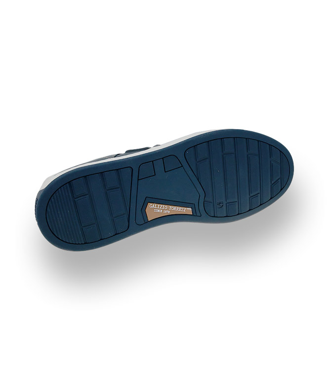 Das coole Running-Modell von Galizio Torresi ist der perfekte Begleiter für heiße Sommertage. Dunkelblaues Kalbsleder wurde mit weißen Akzenten im gepolsterten Fersenbereich ergänzt. Der leichte weiße Keil komplettiert den maritimen Look. Ein Frotteefutter macht aus dem Sneaker einen Barfußschuh mit Wohlfühleffekt. Chic und bequem auf Reisen.