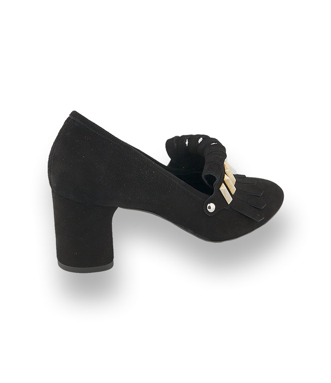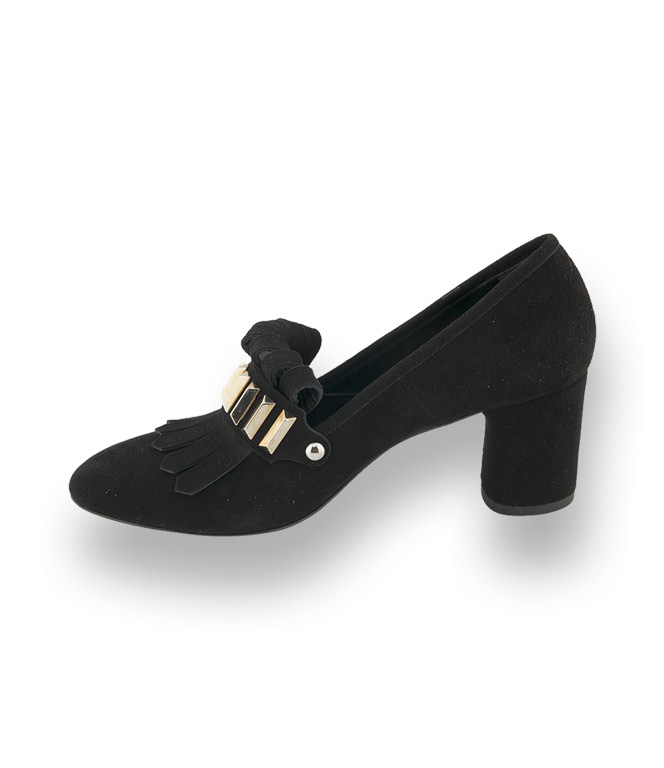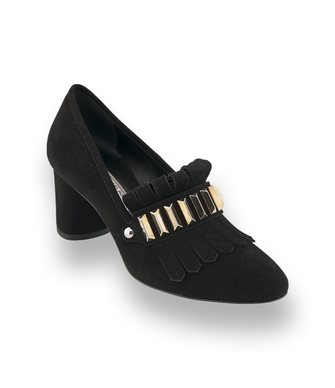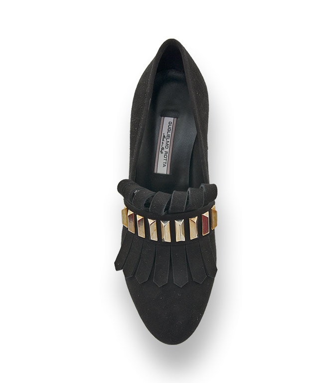 Karos und Streifen beliebt wie nie. Der Reiz verschiedene Motive miteinander zu mischen, da wird der modische Trotteur von Guglielmo Rotta zum Kombinationsweltmeister. Aus hochwertigen Veloursleder in schwarz mit Lederfutter und einer Lederlaufsohle mit Gummieinsatz werden Sie verwöhnt. Traumhafte Qualität im außergewöhnlichem Design mit Fransen und goldfarbenen Schmuck und einem extravaganten runden 6cm hohen Absatz bekommt der Slipper seine ganz spezielle Note.