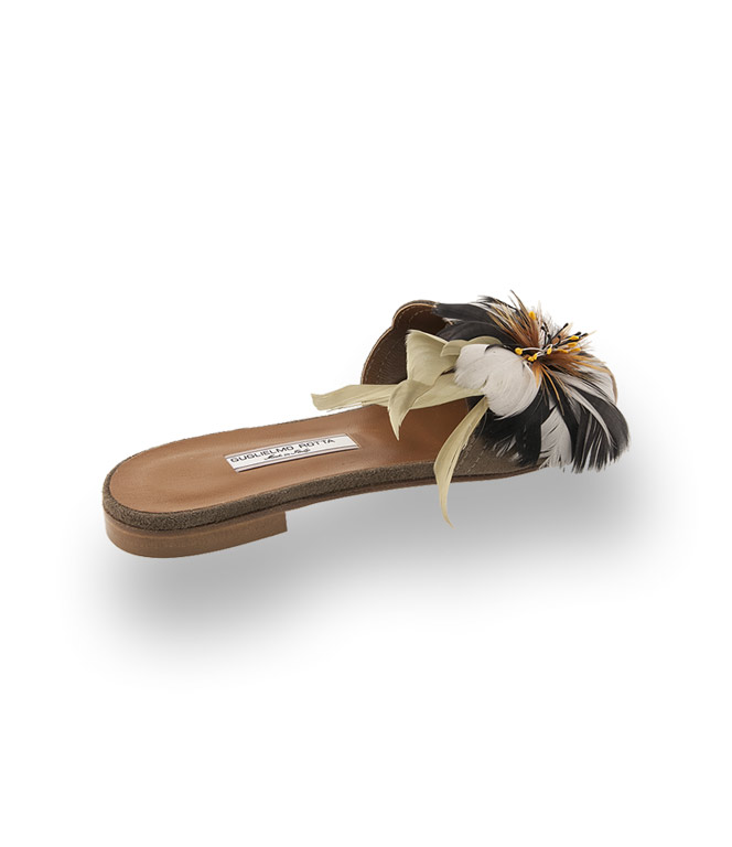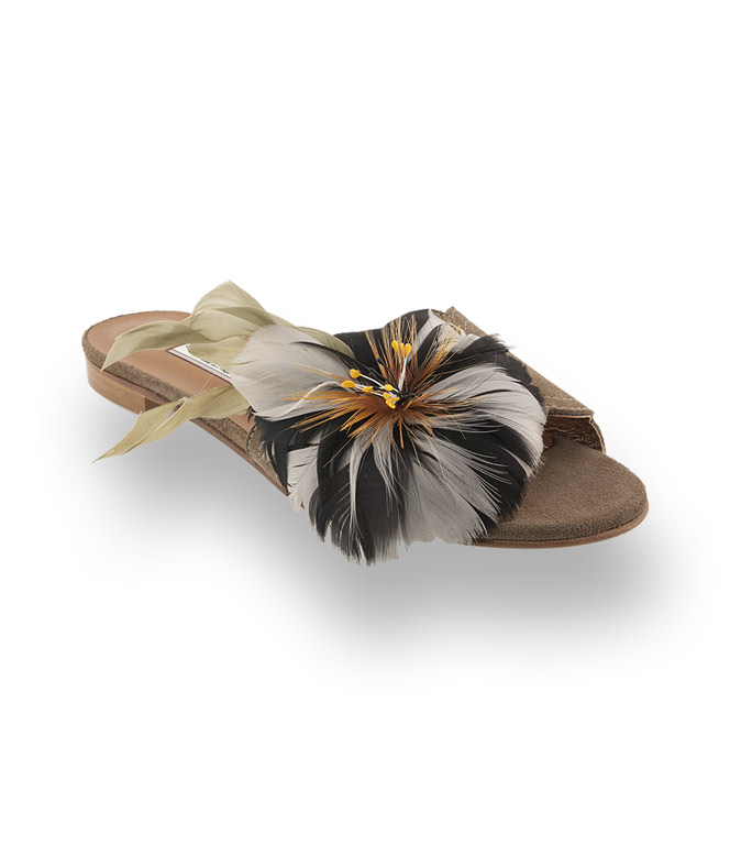 Die liebevoll gestaltete Blüte, aus bunten Federn, sorgt für Aufsehen. Die trendige Pantolette, in khakifarbenen Nubuk, lässt keine Wünsche offen. Die Bandage, mit geschwungener Kante, unterstützt das raffinierte Design und sitzt wie angegossen. Edles Lederfutter, der kleine Schichtabsatz und die Lederlaufsohle machen auch heiße Tage zum Vergnügen. Mit diesem It-Piece sind ihnen Komplimente sicher.