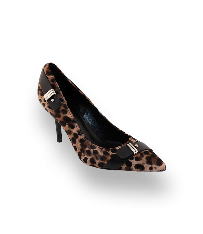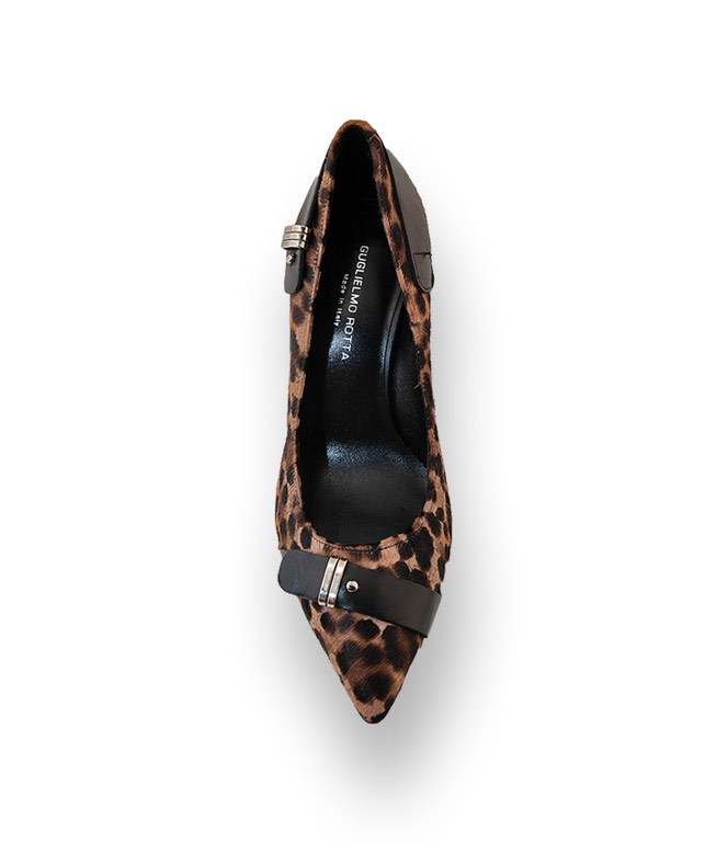 Eine unglaublich facettenreiche und elegante Mode entsteht. Der Pumps von Guglielmo Rotta aus Fell in Leoprint mit einem 8cm hohen Stiletto-Absatz wird zum idealen Begleiter ihres femininen Styles. Weitere Highlights sind die beiden schwarzen Lederriemen mit silberfarbener Schnalle am Vorderblatt und Ferse. Hochwertige Materialien in bester Verarbeitung zeichnen einen Schuh von Guglielmo Rotta aus.