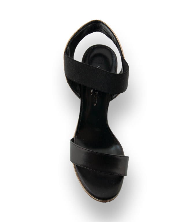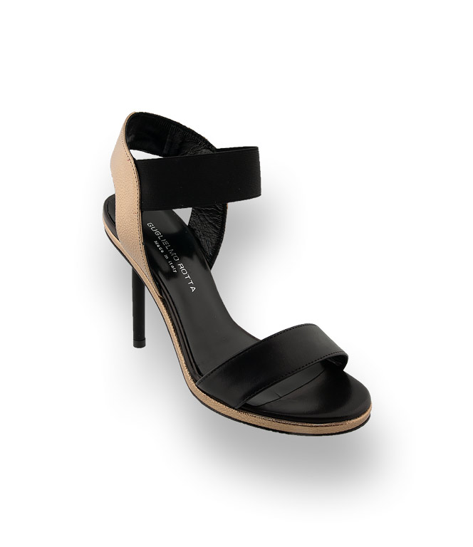 Mit dieser Sandalette von Guglielmo Rotta ist ein gelungener Auftritt garantiert. Schwarzes Kalbsleder, goldfarbener Plateau und Fersenriemen und ein einzigartiger 10cm Absatz im coolen Design verzaubert. Ein breites Gummiband sorgt für den nötigen Halt und bringt ein Hauch Coolness ins Spiel.