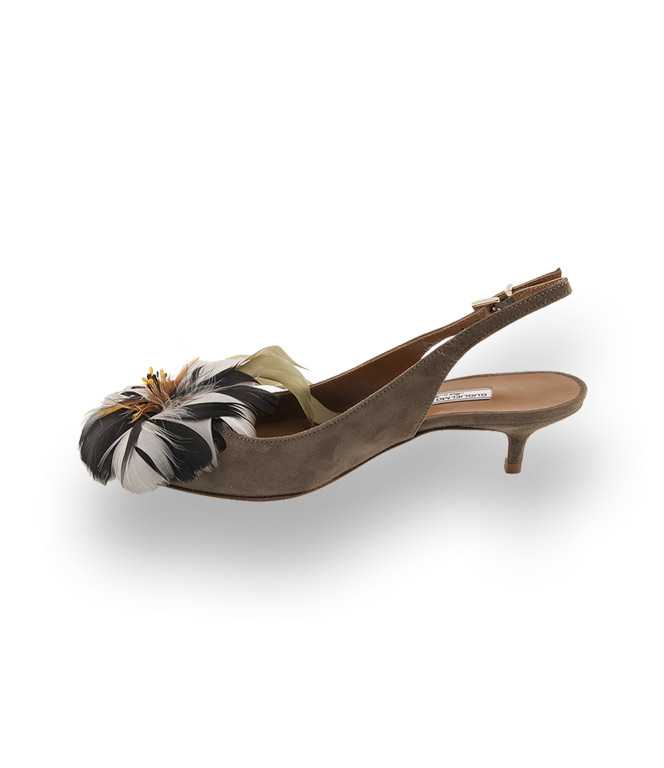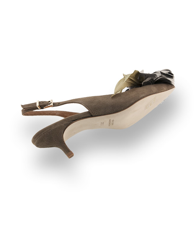 Die aufwendige Blüte, aus bunten Federn, sorgt für Aufsehen. Das Modell in khakifarbenem Nubuk besticht durch seine spitze Form und den trendigen Absatz. Kitten Heels sind elegant und sorgen für Raffinesse. Der traumhafte Sling lässt sich wunderbar kombinieren und veredelt ihre Garderobe im Nu.