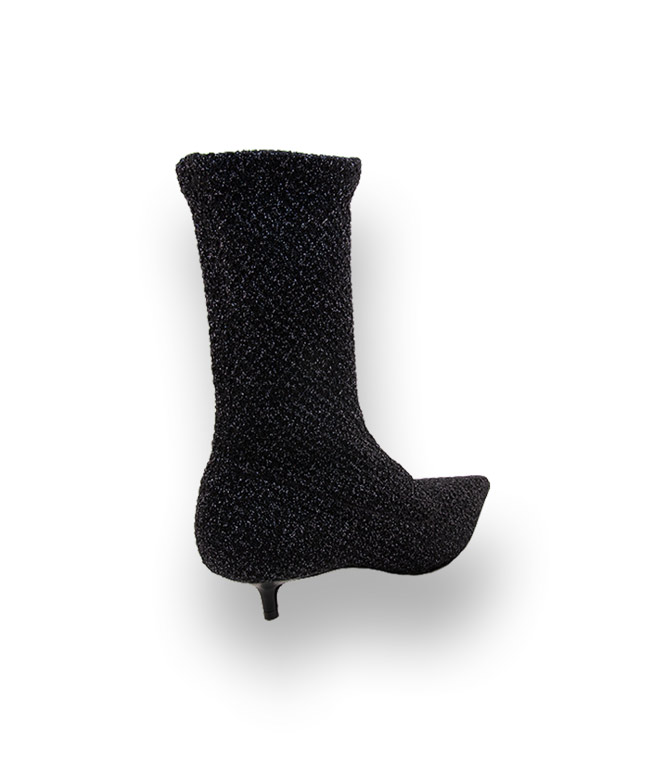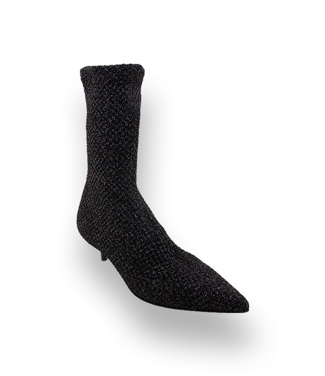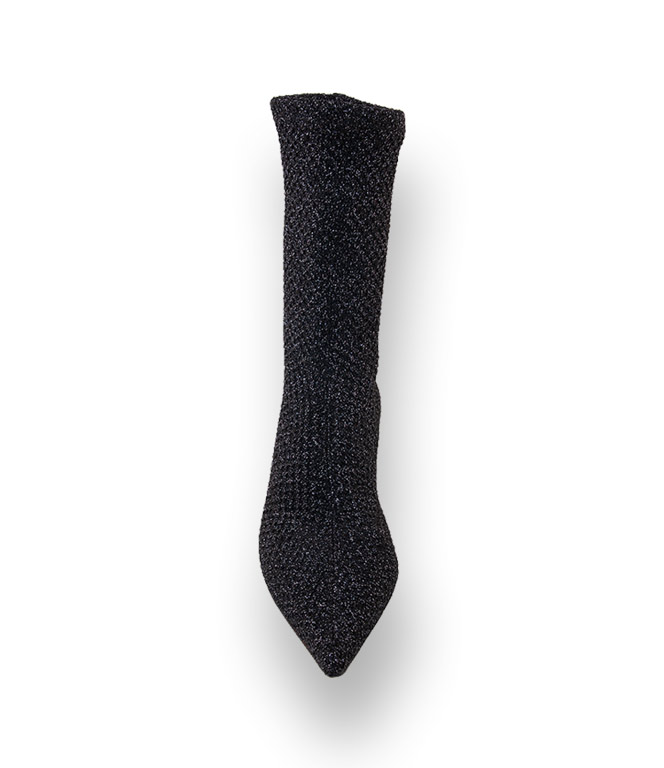 Sock-Boots sind im Rennen und übernehmen die modische Führung. Feminine Sportivität und dekorative Eleganz sind die dominierenden Stichworte und unsere Outfits bekommen eine geheimnisvolle, hochwertige Note. GUGLIELMO ROTTA verwendet schwarz-silbernes Lurex mit spitzer Kappe und ein 4cm hoher Kittenheel unterstreicht den femininen Touch. Hosen bekommen dekorative Abschlüsse, Kleider im 50er Stil und die Stiefelette wird zum modischen Begleiter. Ein Stretchmaterial das überzeugt.