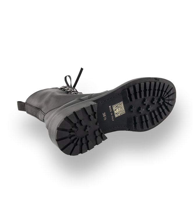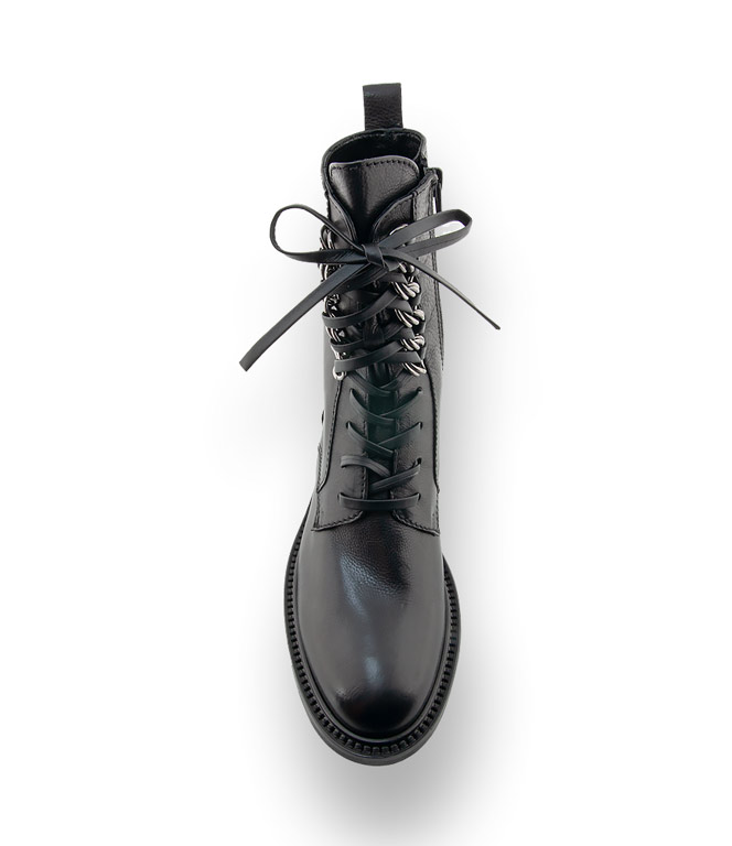 Tolles modisches Detail ist die blinde Schnürung, die Schafthöhe, die silberfarbenen Ösen und der dicke Boden