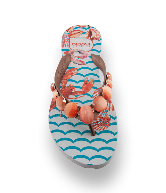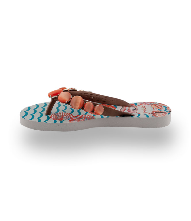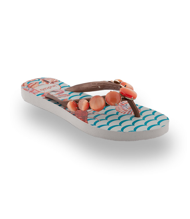 Flip Flops von Indaia mit apricotefarbenen Schmucksteinen und mit einem außergewöhnlichem Print. Wellen, Frutti di Mare auf leichter Kunststoffsohle verschönern den Sommer. Barfüßig in die dekorativen Zehentrenner. Ein leichter Sommerlook für den Trend-Alltag. Große Sehnsucht nach optischer Aufheiterung. Flip Flops von Indaia versprühen Lebenslust und gehören in den Warenkorb.