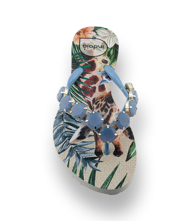 INDAIA- Flipflop in blau mit weiß, große Schmucksteine Print-Giraffe