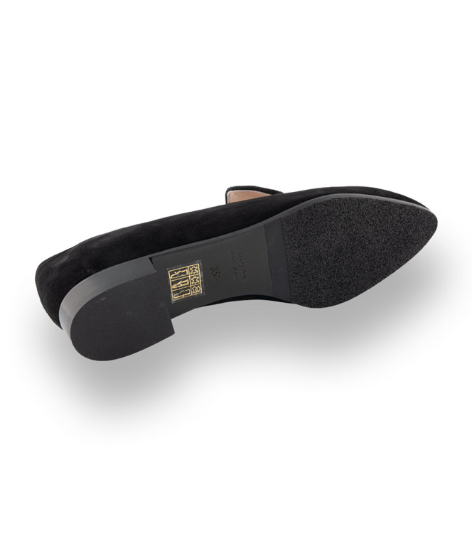 Ripsstreifen in Bi-Color auf super weichem schwarzem Veloursleder gesteppt, zeigt besondere Wirkung und vervollständigt ihr Power-Outfit. Es steckt viel Liebe im Detail. Schwarze Ripseinfassung, spitze Leistenform und geschmeidiges Lederfutter sorgen für hohen Tragekomfort. Ein Allrounder für alle Gelegenheiten, auch vor Nässe sind die Slipper durch eine rutschsichere Gummilaufsohle geschützt.