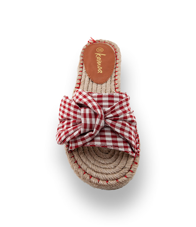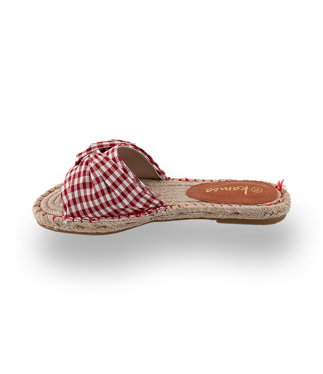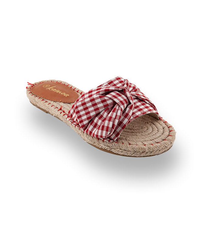 Espadrille-Slides von Kamoa wecken Lust auf Sonne und Meer. Karierte Baumwolle hübsch verknotet und eine Hanfsohle die besonders angenehm auf nackter Haut ist, verwöhnt Sie an heißen Sommertagen.