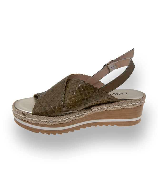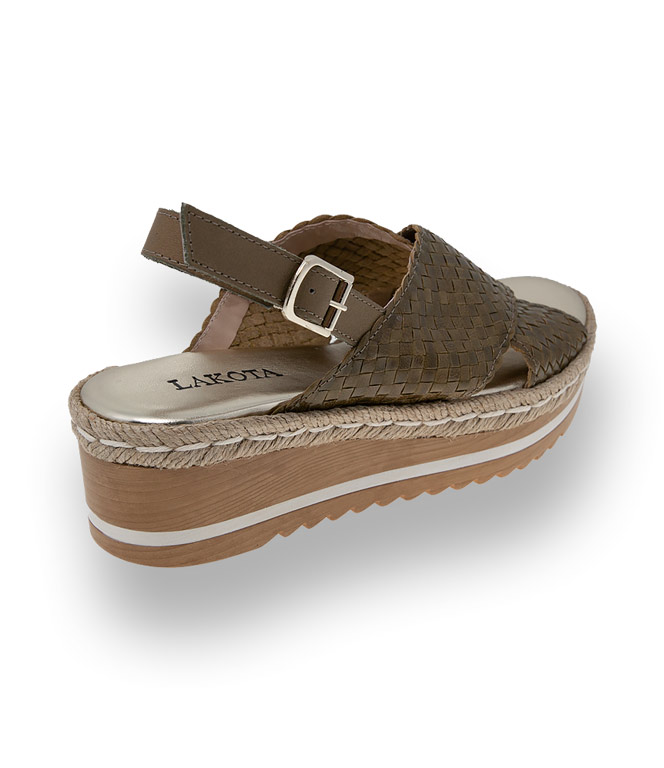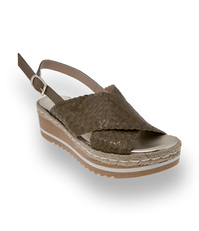 Ungefüttertes geflochtenes grünes Leder verwöhnt ihre Füße. Die gekreuzten Bandagen und der verstellbare Riemen bieten sicheren Halt. Der farblich abgestimmte Keil mit weißem Streifen und Haifischlaufsohle ist chic und bequem. Ein weiteres Highlight ist der Rahmen aus naturfarbenem Rupfen. Die sportive Sandalette ist der ideale Begleiter im Alltag und auf Reisen. Die gepolsterte Decksohle verwöhnt ihre Füße.