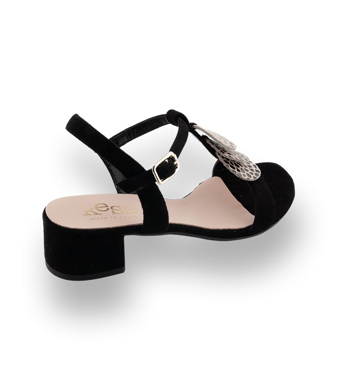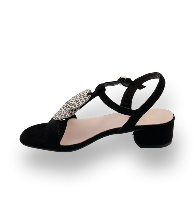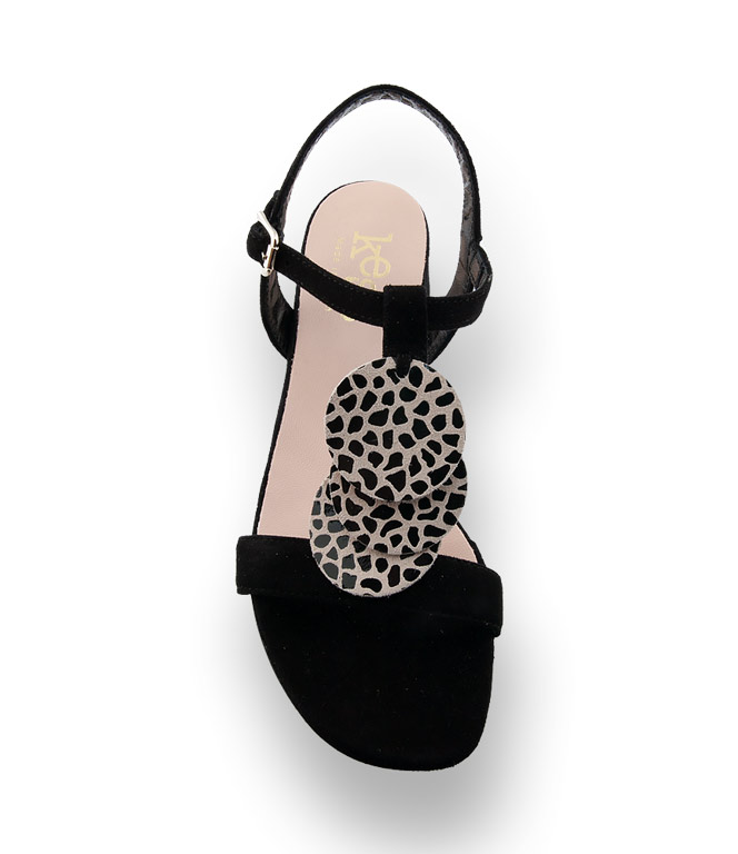 Schwarzes Velour wurde mit schwarzem Animalprint auf beigem Grund aufgepeppt. Drei runde bewegliche Blättchen auf der T-Spange verleihen der Sandalette das gewisse Extra. Der verstellbare Riemen bietet sicheren Halt. Der blockige Absatz misst 3,5 cm und sorgt mit der flexiblen Gummilaufsohle für einen Wohlfühleffekt.