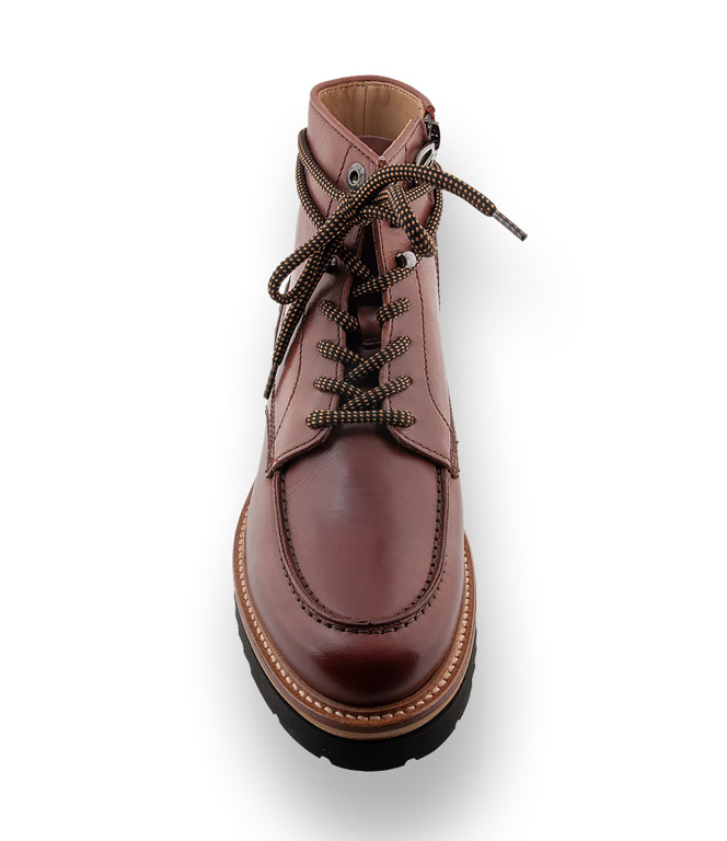 Die durchgenähte Stiefelette ist mit hochwertigem Leder gefüttert. Ein Reißverschluss erleichtert den Schlupf. Die profilierte Gummilaufsohle, der braune Rahmen, die Wulstnaht und die zweifarbigen Schuhbänder sprechen für sich.