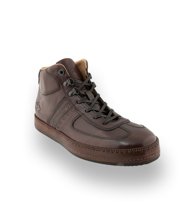 Der geschnürte Boot in dunkelbraun von La Martina überzeugt den anspruchsvollsten Mann. Obermaterial und Futter sind aus hochwertigem Kalbsleder gearbeitet. Durch den markanten Schriftzug und die dezenten Ziernähte bekommt dieser Sneaker seine extravagante Note. Die durchgenähte Gummisohle und der überzogene Keil, in rehbraun, mit Ziernähten, sind ein weiteres Indiz für die hochwertige Handwerkskunst.