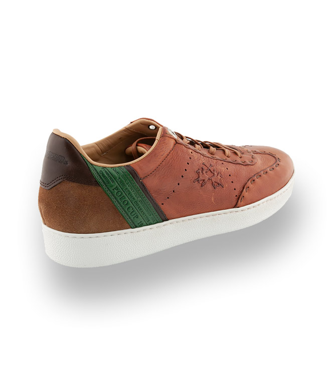 Top Sneaker von La Martina sind für alle Lebenslagen geeignet. Hohe Handwerkskunst gespickt mit modischen Details wie weiße flexible Plateausohle, grobe Ziernähte, braunes Kalbsleder und ein grüner Lederstreifen mit Firmenlogo peppen das Modell. Zur Jeans oder Chino, ins Office oder Freizeit mit diesem Sneaker sind Sie bestens beraten. Hochwertiges Lederfutter mit einem herausnehmbaren Lederfußbett und die weichgepolsterte Ferse versprechen höchsten Tragekomfort.