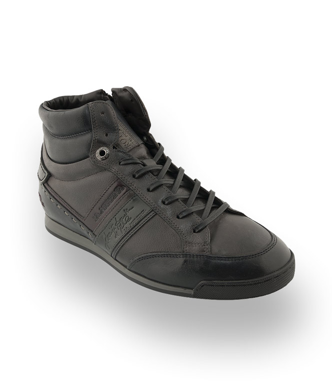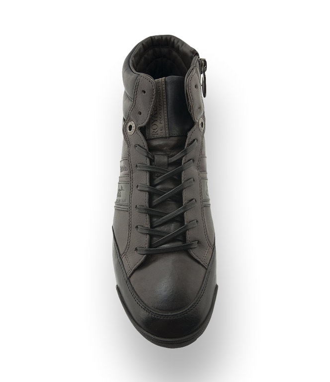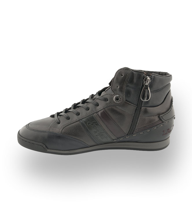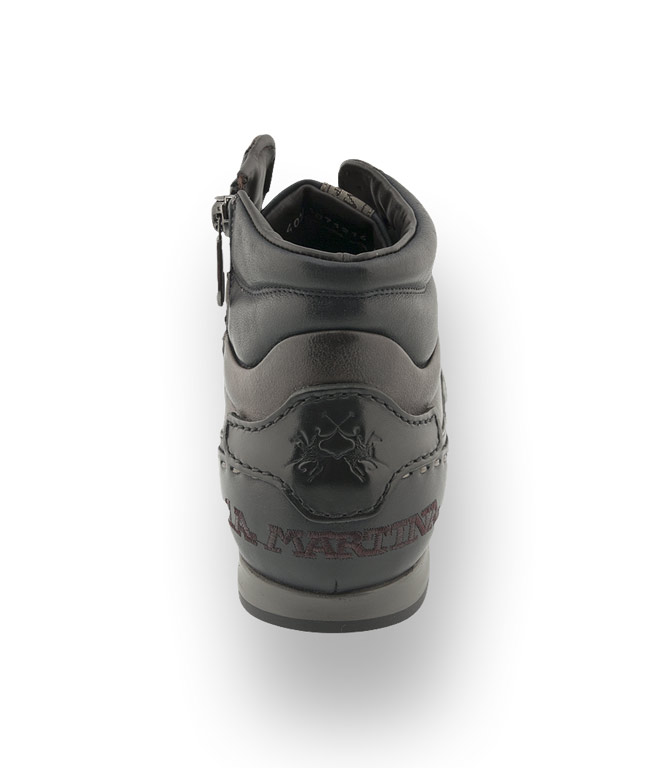 Ein Grauton wird mit dunkelblau kombiniert und die blaue Ferse bekommt eine Logoprägung. Das Schaftende ist besonders weich gepolstert. Die High-Sneaker von La Martina überzeugen durch hochwertiges Material. Weiches Kalbsleder, flexible Gummisohle, Lederfutter und eine austauschbare, sehr angenehme Lederinnensohle sorgen für einen hohen Tragekomfort. Ein Reißbverschluss optimiert den schnellen Einstieg. Superleichte Sneakerbooties im einzigartigen Design für sportliche Männer mit hohen Ansprüchen.
