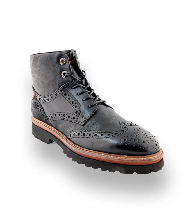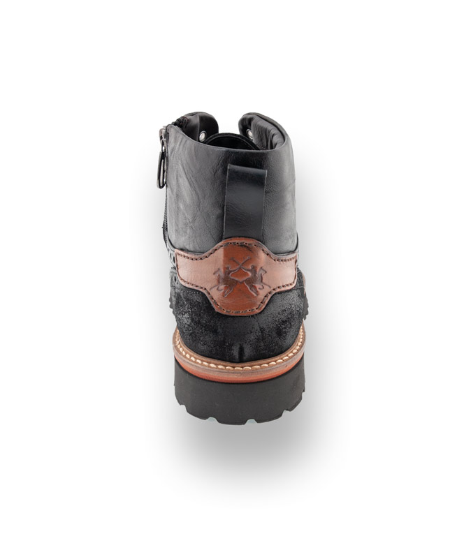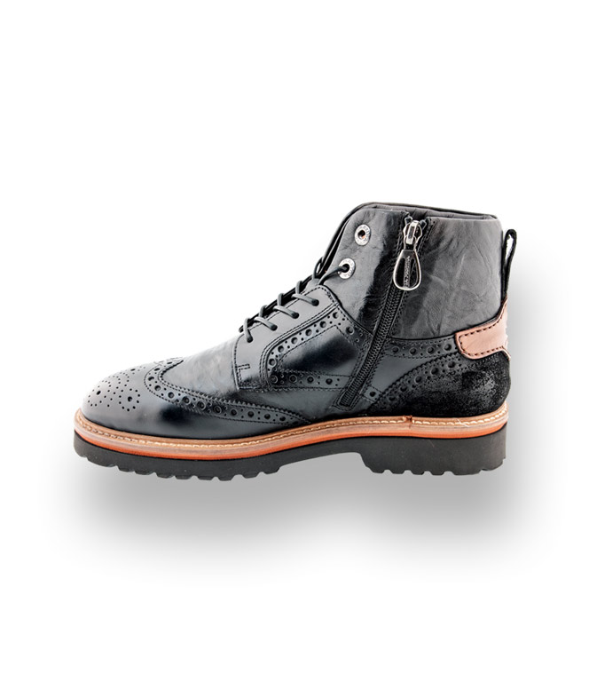 Der modische Schnürboot in schwarzem Kalbsleder mit braunen Details verführt zu einem Spaziergang durch den verschneiten Winterwald. Kuscheliges Lammfellfutter sorgt für warme Füße an kalten Tagen. Das Budapester Lochmuster und die Flügelkappe. unterstreichen den klassischen Look. Die durchgenähte Stiefelette erfüllt selbst höchste Ansprüche. Ein Reißverschluss ermöglicht einen leichten Einstieg. Die profilierte Gummilaufsohle bietet sicheren Stand und Schutz vor Nässe.