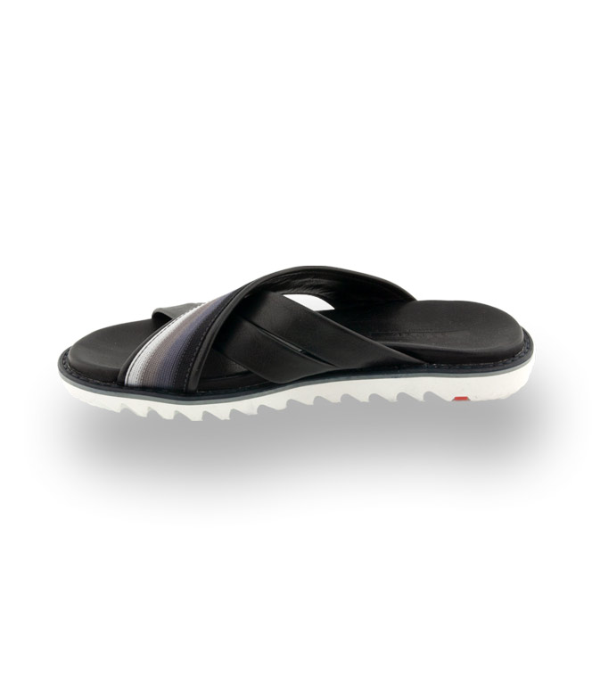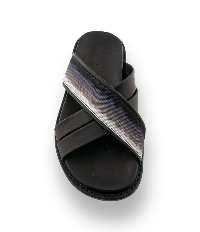 LLOYD präsentiert mit dem Modell ELFORD eine Pantolette aus schwarzen Glattleder mit Stoffband.