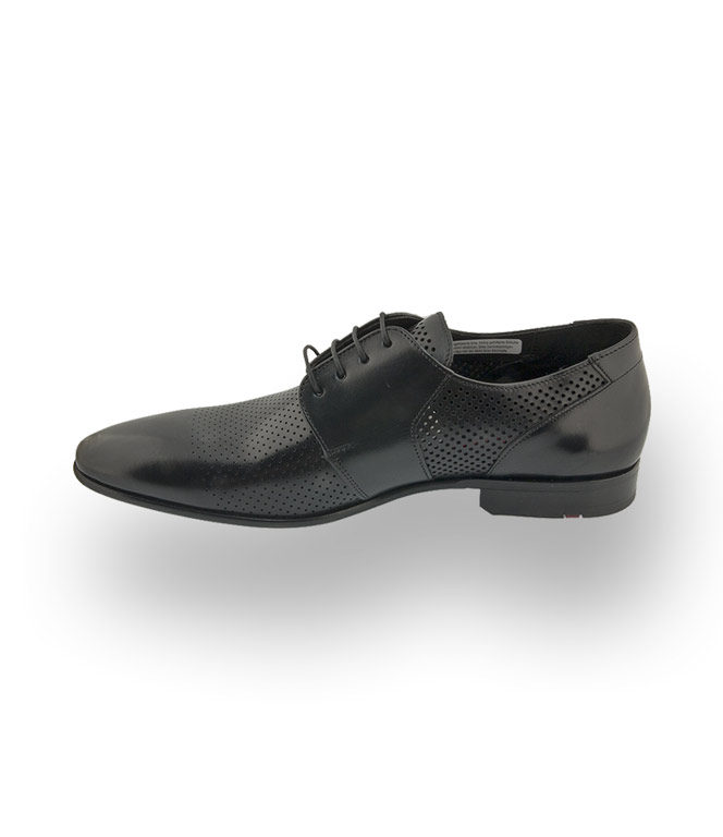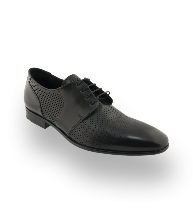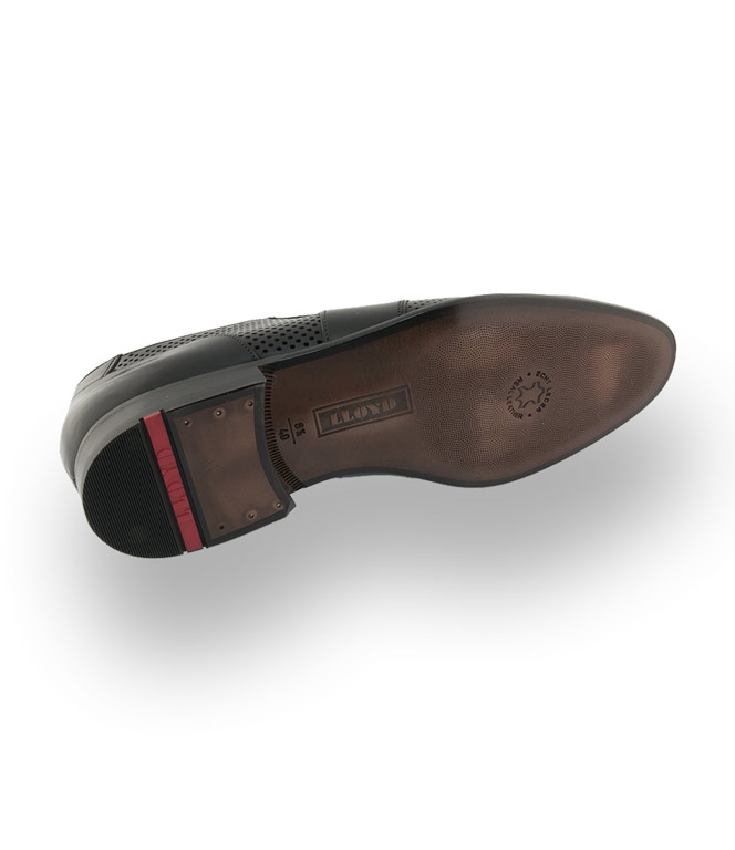 Eleganter schwarzer Schnürschuh in weichem Kalbsleder von Lloyd. Kleine gestanzte Löcher unterbrechen gekonnt die schlichte Linienführung und sind ein markantes Detail. Die Derbyschnürung garantiert eine optimale Passform und die Lederlaufsohle verspricht einen hohen Tragekomfort.