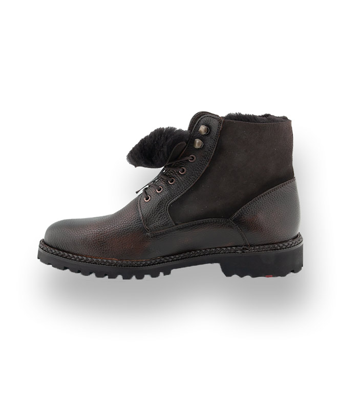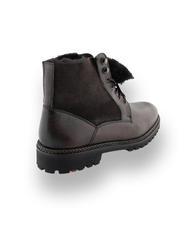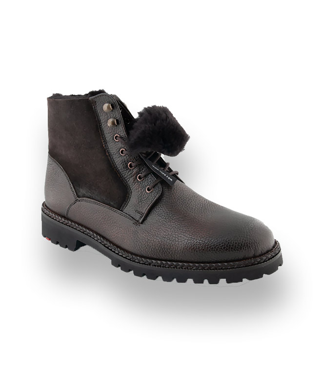 Kerniger braune Herrenstiefelette von LLOYD. Der Materialmix und das genarbte Leder geben dem Schuh seinen ganz eigenen Charakter. Weiches Lammfell wärmt die Füße bei Kälte und die stark profilierte Sohle geben einen rutschsicheren Halt.