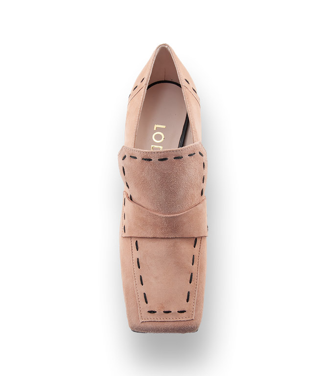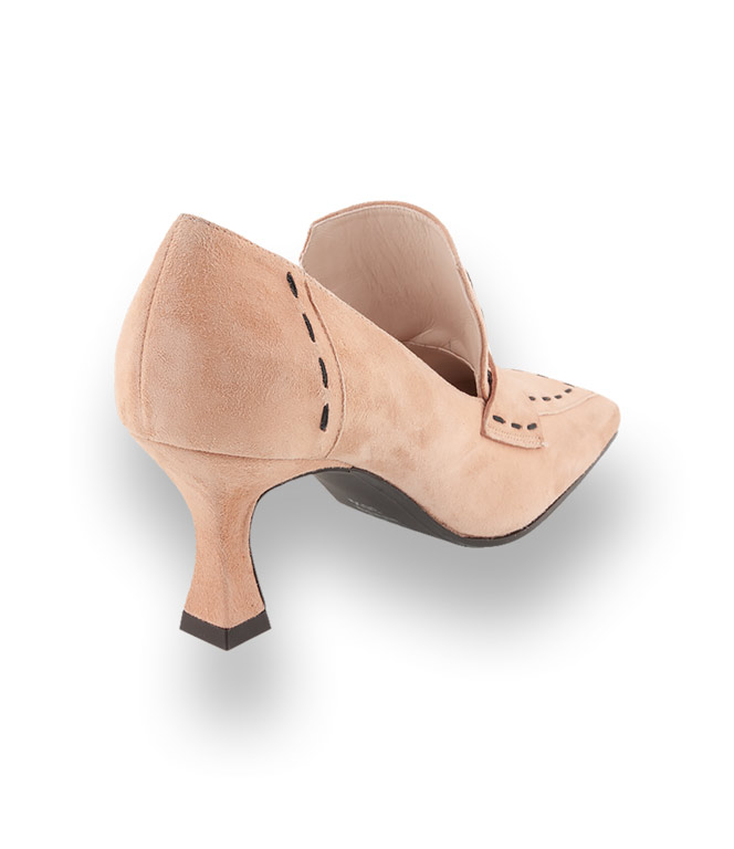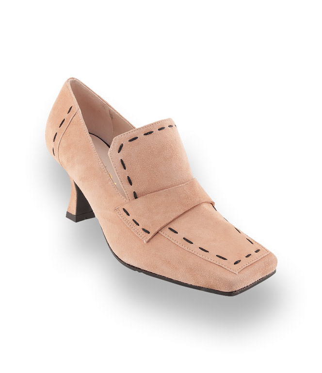 Eine sagenhaft ansprechende Schuhmode die in keinem Schuhschrank von modeaffinen Frauen fehlen darf. Nudefarbenes Veloursleder und ausdrucksstarke schwarze Stiche heben das Modell hervor. Extreme Karreeform, hohe Lasche mit Steg ein traumhaftes Design verführt. Für einen hohen Tragekomfort sorgt ein weiches Lederfutter mit einer integrierten Gelsohle und gegen Nässe schützt eine Gummilaufsohle.