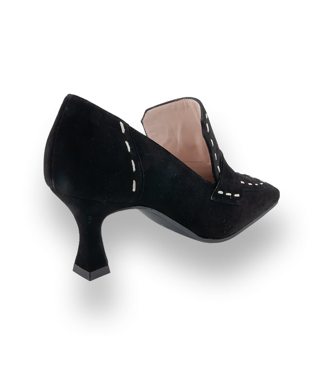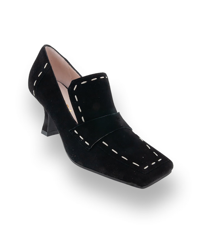 Eine sagenhaft ansprechende Schuhmode die in keinem Schuhschrank von modeaffinen Frauen fehlen darf. Schwarzes Veloursleder und ausdrucksstarke wollweisse Stiche heben das Modell hervor. Extreme Karreeform, hohe Lasche mit Steg ein traumhaftes Design verführt. Für einen hohen Tragekomfort sorgt ein weiches Lederfutter mit einer integrierten Gelsohle und gegen Nässe schützt eine Gummilaufsohle.
