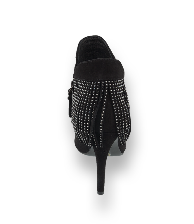 Schwarzer Peeptoe mit Stil: zehenfrei, extrem hoch und stylish! Die neuesten Lola Cruz Schuhe lassen Frauenherzen höher schlagen. Fransen mit Strass, neun Zentimeter hohe Absätze und Ledersohlen mit Gummieinsatz zeichnen das neue Schuhmodell von Lola Cruz aus. Die eleganten schwarzen Pumps aus pflegeleichten Velours sind zu jedem Anlass tragbar. Der Lola Cruz Peeptoe mit einer Gesamtschafthöhe von 15 cm macht jedes Outfit komplett. Mit Jeans, kurzen Hosen, Kleid oder Minirock kombiniert, zieht der „Flamenco-Pumps“ alle Blicke auf sich. Das raffinierte Schuhwerk, was überdies noch Zehenfreiheit garantiert, darf in keinem Schuhschrank fehlen. Reißverschlüsse an den Seiten sorgen für den bequemen „Einstieg“.
