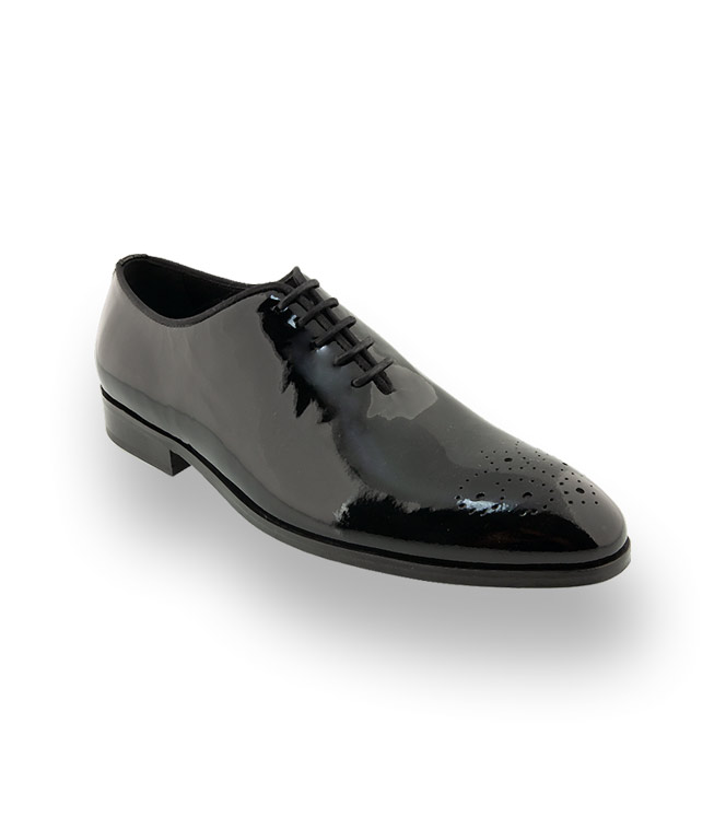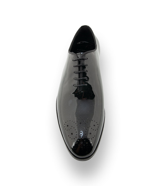 Der schwarze Oxford-Schnürer in weichem Kalbslack, ist in traditioneller Handwerkskunst gefertigt und erfüllt selbst höchste Ansprüche.