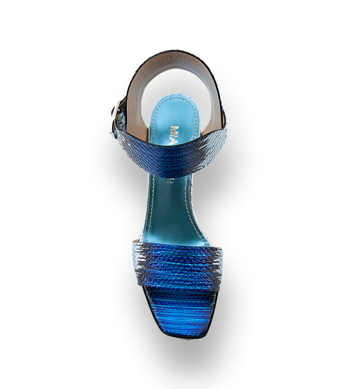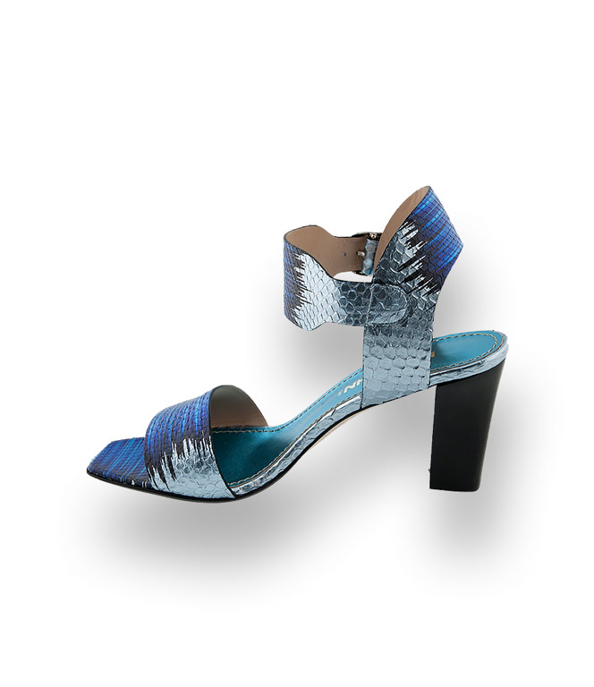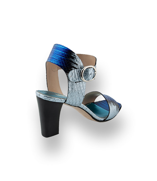 Eine Sandale die überall passt, zum Business-Meeting bis in die Bar. Aus kostbaren blau- metallicfarbenen Schlangenleder wirkt sie außerordentlich feminin und sehr verführerisch. In modischer Karreeform, einem bezaubernden Fesselriemen und glänzemdem Lederfutter, steht die Sandale im modischen Fokus. Ein Sommerschuh für ihren großen Auftritt.
