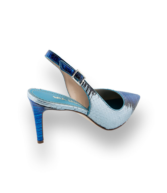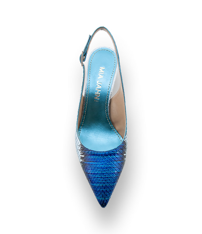 Traumhafte Farbspiele repräsentieren den Sommer. Slingback-Pumps aus kostbaren Schlangenleder in blau Metallic und ein 7cm hoher Stiletto-Absatz verlängert ihre Beine und verleiht Sexappeal. Handwerkliches Know-How aus Italien. Feinstes Futterleder und eine Lederlaufsohle verstärken den Tragekomfort.