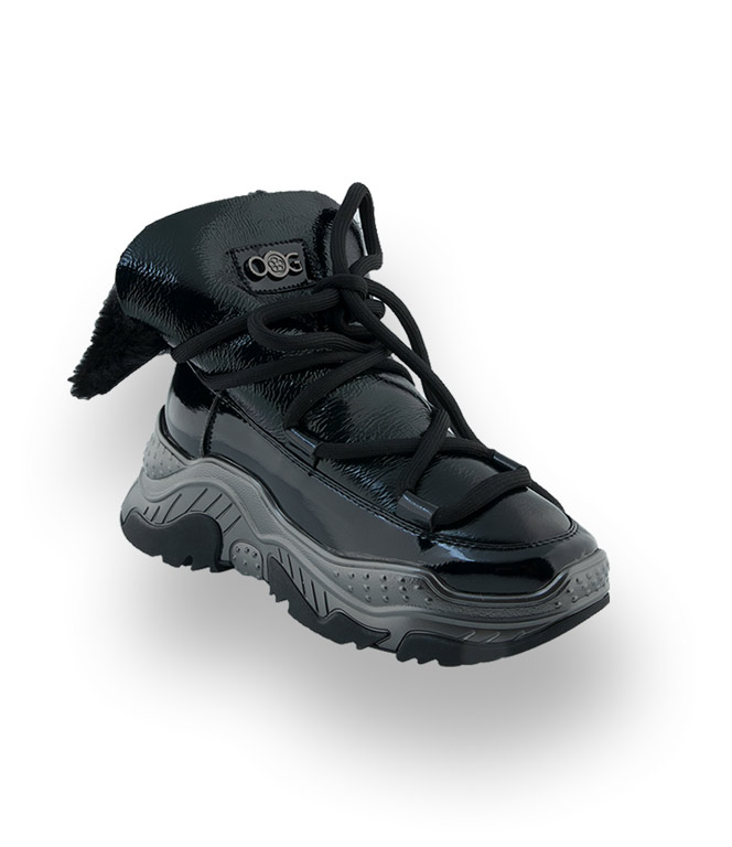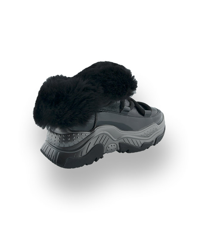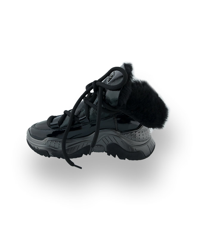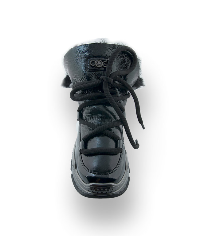 Der offene Schaft wurde aus glänzendem Lackleder gefertigt, und ist mit kuscheligem, schwarzem Lammfell gefüttert. Die Verbindung zur Sohle besteht aus synthetischem Material und ist somit wasserfest. Die markante, hochgezogene Sohle mit den schwarzen Einsätzen bietet hohe Rutschsicherheit. Das runde, schwarze, über Kreuz, geführte Band hält den Schaft zusammen und kann variabel angepasst werden. Das Firmenlogo in Metall schmückt den Schaft.