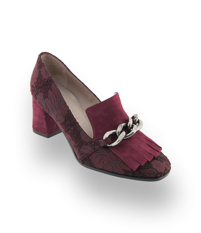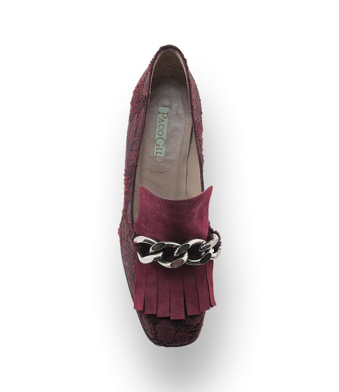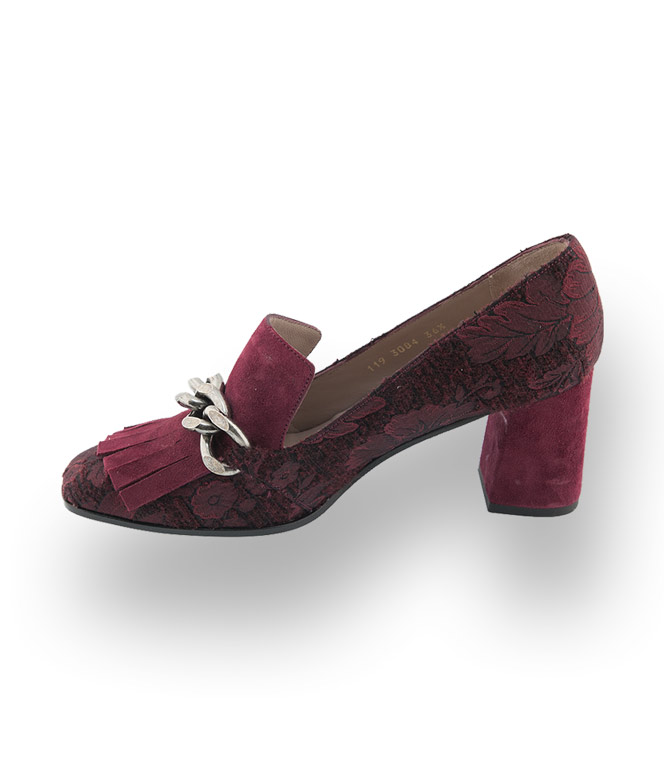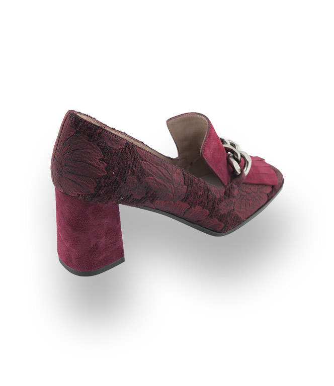 Paco Gil Pumps mit Lasche aus Brokatstoff Bordeaux mit Silberkette