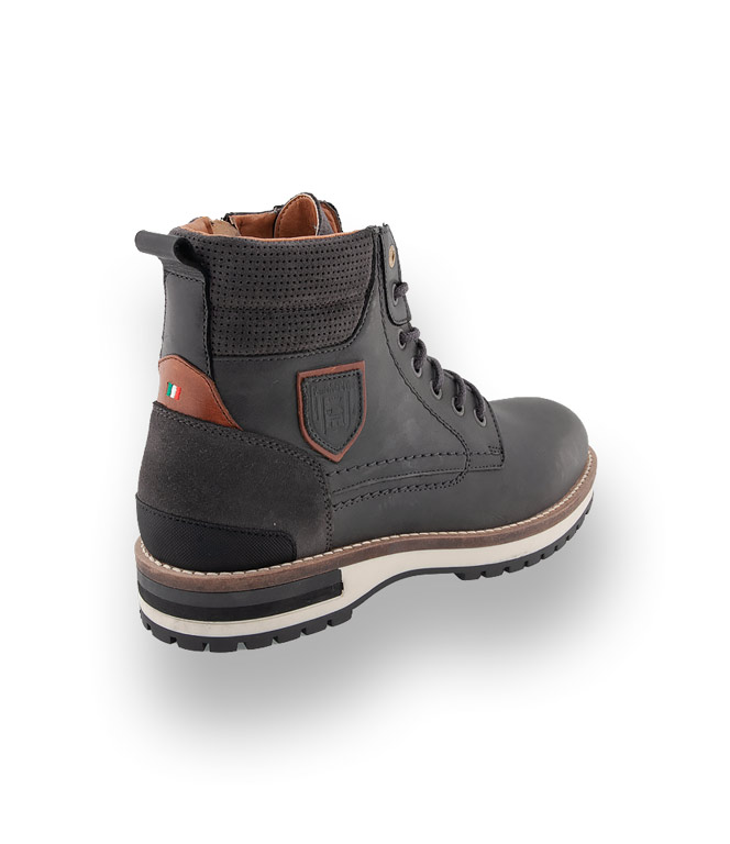 Die Schnürstiefeletten von Pantofola d'Oro aus grauem Fettleder sorgen für modische Vielfalt. Schöne Details, wie die Italienflagge und die grauen Streifen im Absatz setzen frische Akzente. Ein zusätzlicher Reißverschluss gewährt einen angenehmen Einstieg und die sehr leichte Microsohle mit rutschsicherem Profil verleiht dem Stiefel sportliche Coolness.