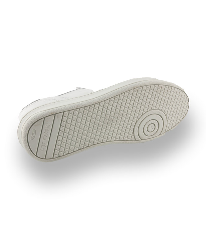 Weißes Glattleder wurde mit hellgrauem Velour ergänzt. Gestanzte Löcher, das Firmenlogo und die gestickte Flagge Italiens unterbrechen den strengen Look. Die weiße, flexible Gummilaufsohle bietet Rutschsicherheit und lädt auf eine Segeltour ein. Der gepolsterte Rand und die austauschbare Innensohle sorgen für Bequemlichkeit.