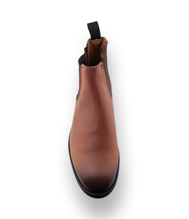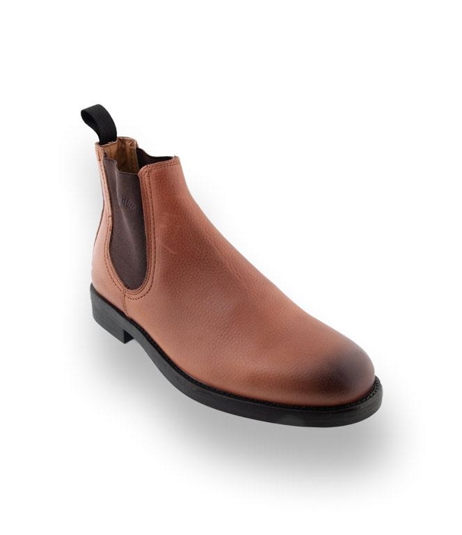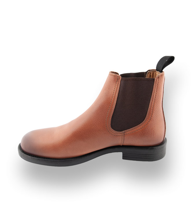 Aus genarbtem Rindsleder in Cognac, Elasthaneinsätze für den schnellen Einstieg und eine strapazierfähige Gummilaufsohle, lassen auch schlechtes Wetter zu. Lässige braune Booties werden zu idealen Begleitern für Büro und Freizeit.