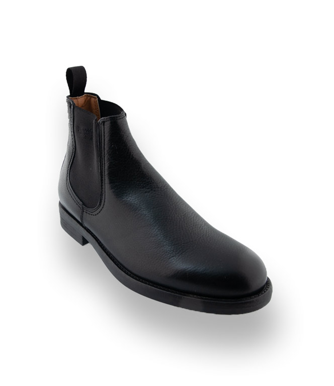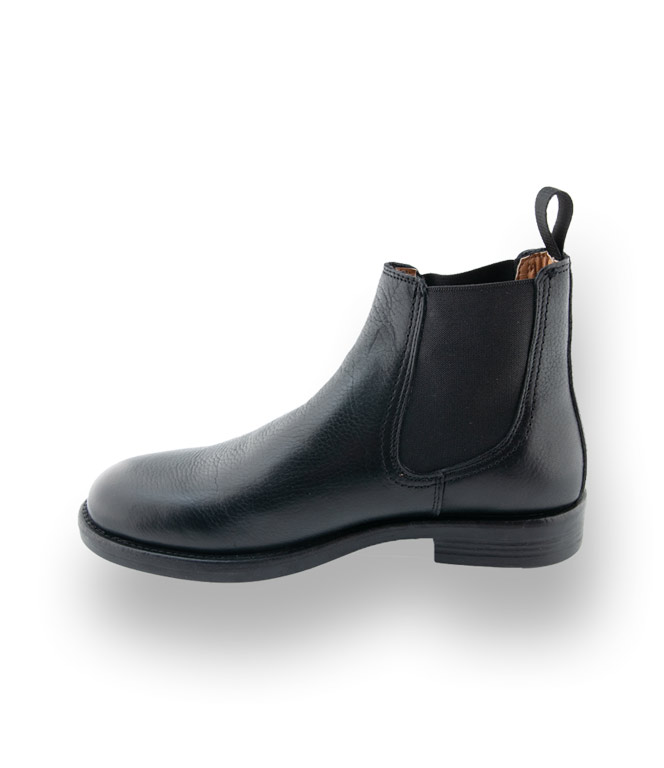 Aus genarbtem Rindsleder in schwarz, Elasthaneinsätze für den schnellen Einstieg und eine strapazierfähige Gummilaufsohle, lassen auch schlechtes Wetter zu. Lässige schwarze Booties werden zu idealen Begleitern für Büro und Freizeit.