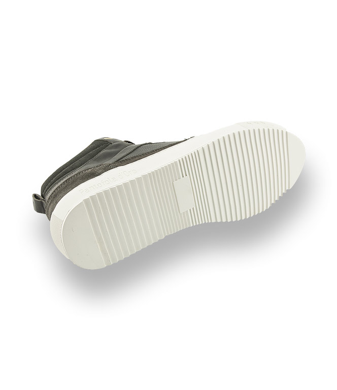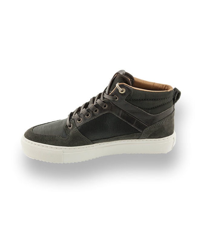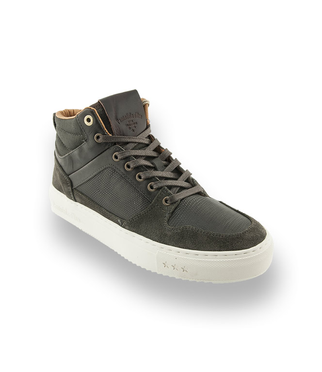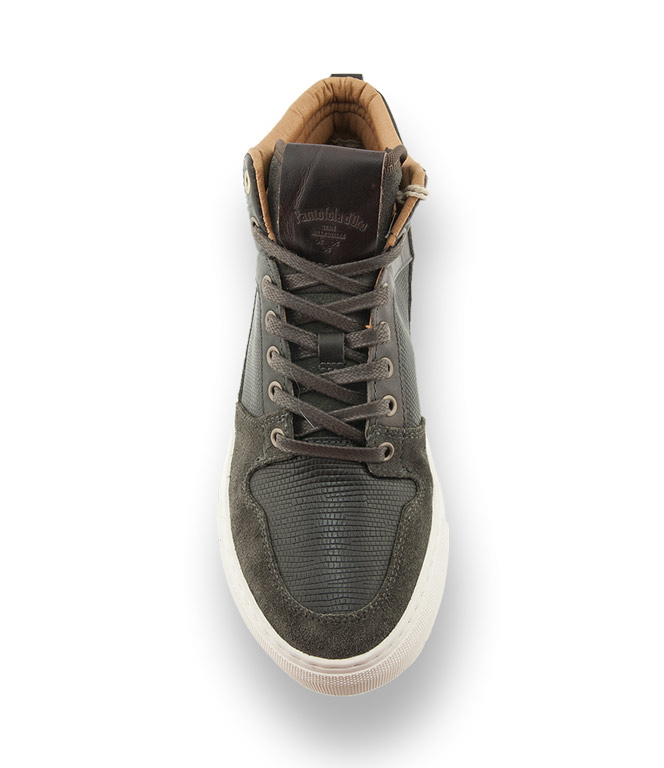 Der High Sneaker von Pantofola d'Oro überzeugt durch seine Leichtigkeit. Grünes, geprägtes Leder im Eidechsprint wird mit Meshtextil am Schaft und Veloursleder kombiniert. Weiches Leder, flexible Gummisohle, eine austauschbare gepolsterte Lederinnensohle sorgen für einen hohen Tragekomfort.