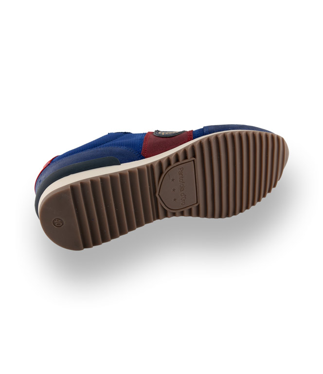 Pantofola d'Oro setzt auf Farbe und Materialmix. Royalblaues Leder wurde mit hochwertigen Stoffeinsätzen und roten Akzenten ergänzt. Das Firmenlogo in der Seitenpartie und die 3 Sterne im Fersenbereich sind ein markantes Merkmal dieses Modells. Die helle Gummilaufsohle mit naturfarbenem Haifischprofil und blauem Einsatz im Fersenbereich ist flexibel und dämpft ihre Schritte. Der gepolsterte Rand und die austauschbare Innensohle sorgen für Bequemlichkeit.
