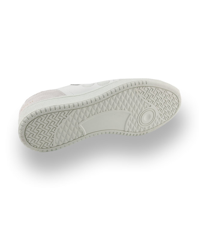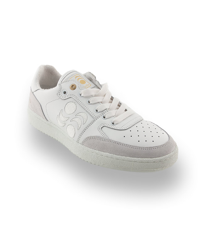 Weißes Glattleder wurde mit Einsätzen in Velour ergänzt. Gestanzte Löcher gestickte Monde unterbrechen den strengen Look. Frotteefutter und eine austauschbare Luftpolstersohle sorgen für ein Wohlfühlerlebnis. Die weiße, flexible Gummilaufsohle bietet Rutschsicherheit und bestens für's Boot geeignet.