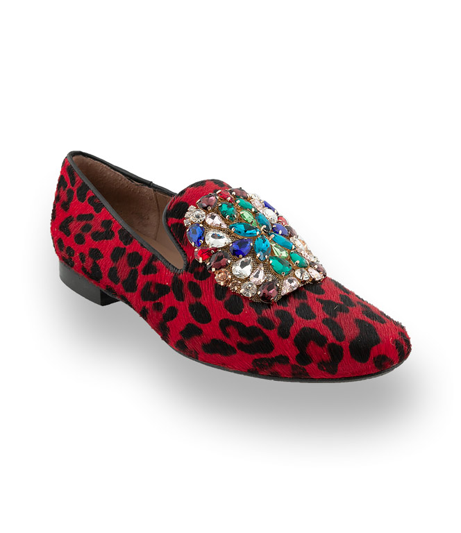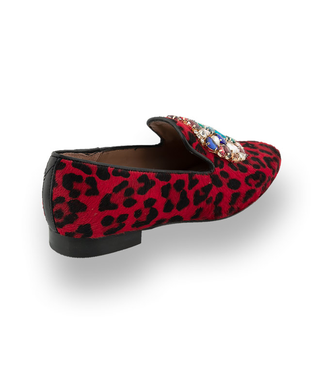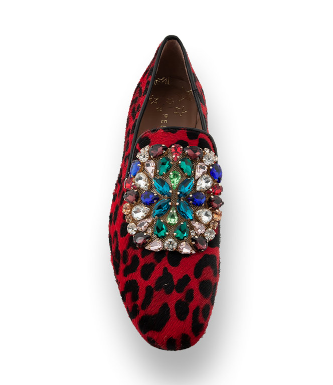 Der rote Loafer von Pedro Miralles verziert mit einer gigantischen Schmuckbrosche aus bunten Kristallen wird zum Kombinationstalent. Zum Kleid, Rock und Hose für Business und Freizeit ein idealer Begleiter der für Aufsehen sorgt. Ein Impulsgeber für ihr Outfit und ihre Kreativität ist geweckt. Bedrucktes Fell, hochwertiges Lederfutter und eine weich gepolsterte Lederdecksohle sorgen für hohen Tragekomfort.